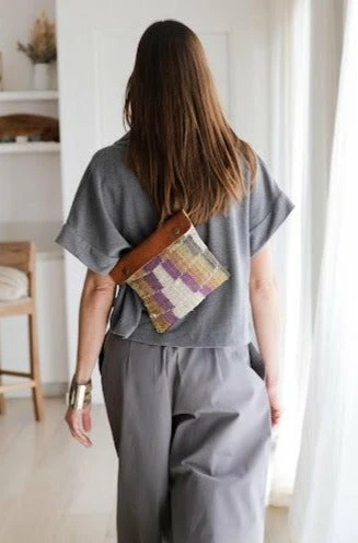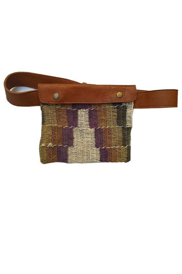 Chaguar Belt Bag with leather and Chaguar knitted body with Yica technique. Handwoven by Wichí women in the North of Argentina, using ancestral techniques and natural dyes and fibers. Chaguar is a forest plant that grows in the Gran Chaco region of Argentina.