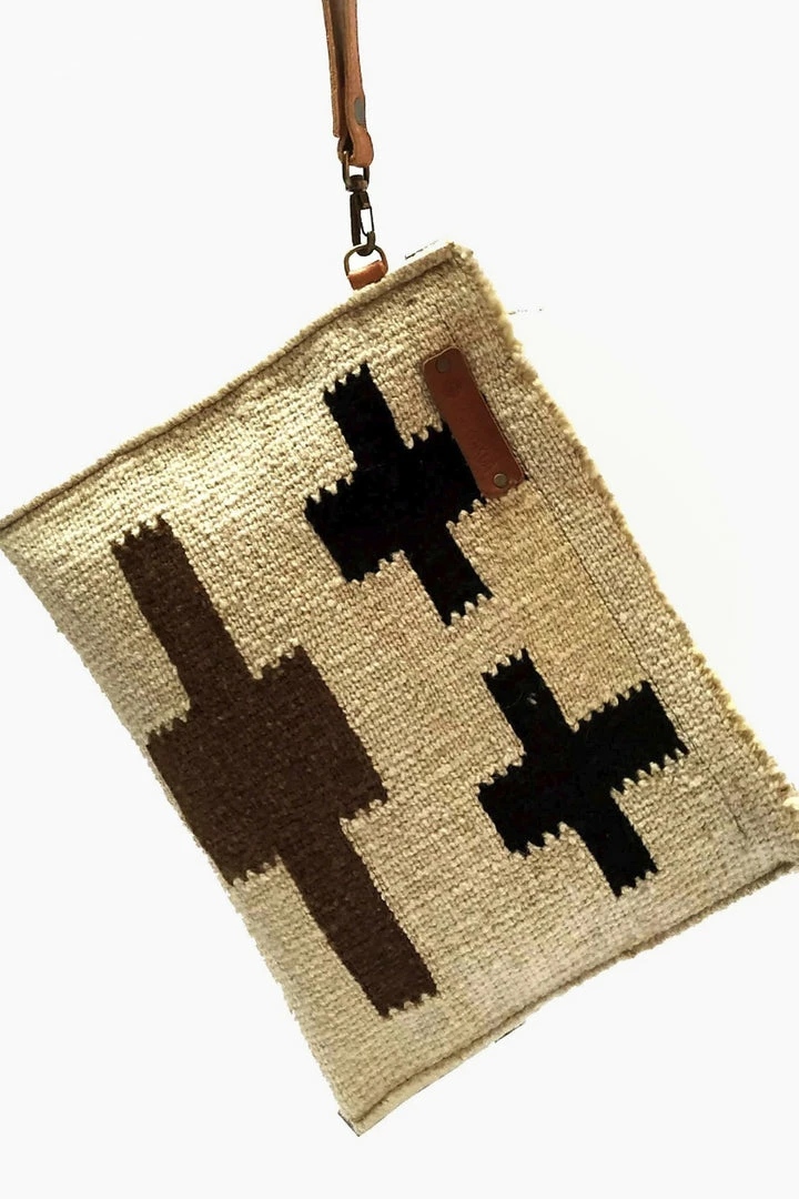 Solana Clutch handmade with wool tapestry, leather wristband, and zipper clutch. Handmade by Qomle’ec women with sheep wool.Â