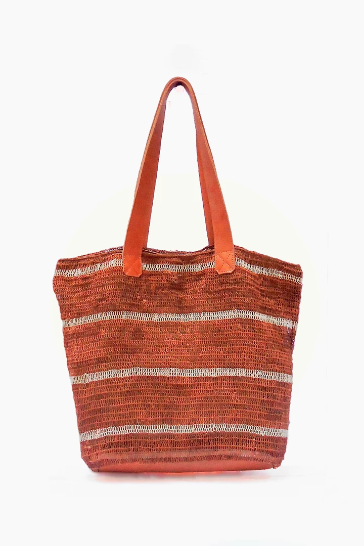 Suri Tote with leather straps and bottom, cloth lining and Chaguar knitted body by Yica techinique. Handwoven by Wichí women in the North of Argentina, using ancestral techniques and natural dyes and fibers. Chaguar is a forest plant that grows in the Gran Chaco region of Argentina.