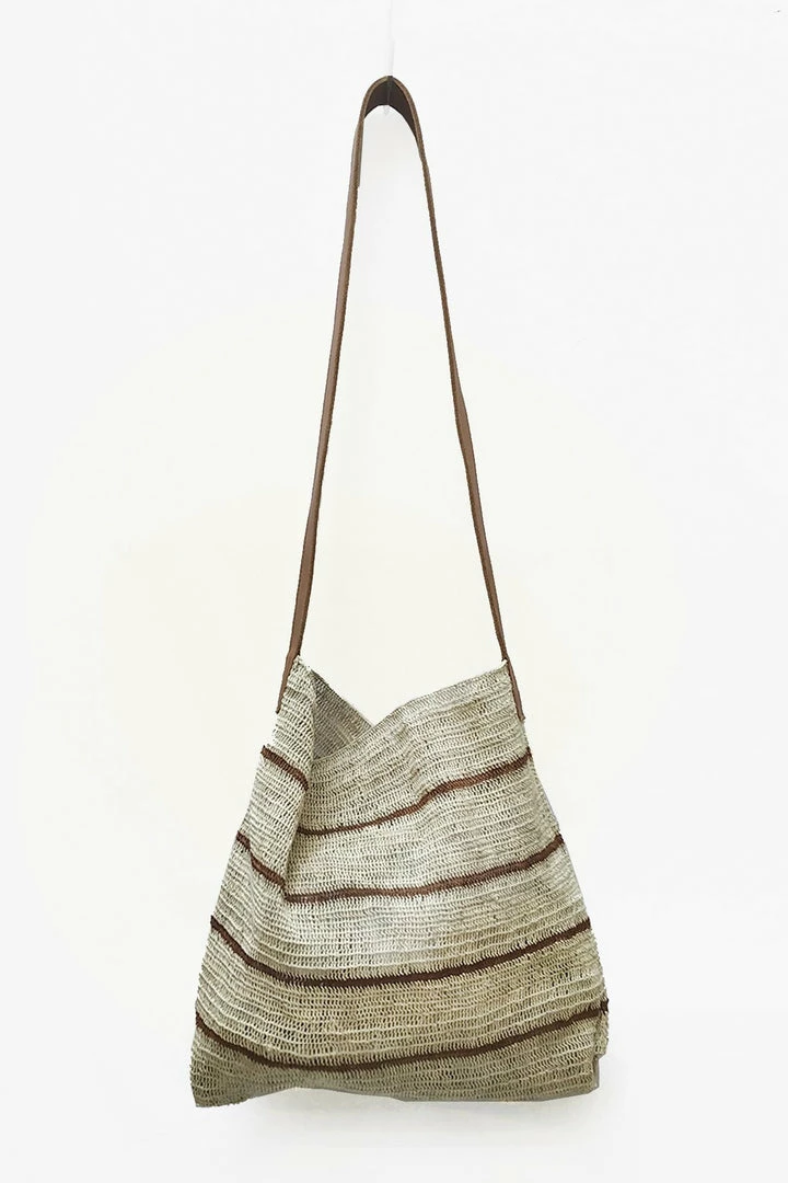 Susana bag with leather long strap and Chaguar knitted body with Yica technique. Handwoven by Wichí women in the North of Argentina, using ancestral techniques and natural dyes and fibers. Chaguar is a forest plant that grows in the Gran Chaco region of Argentina.