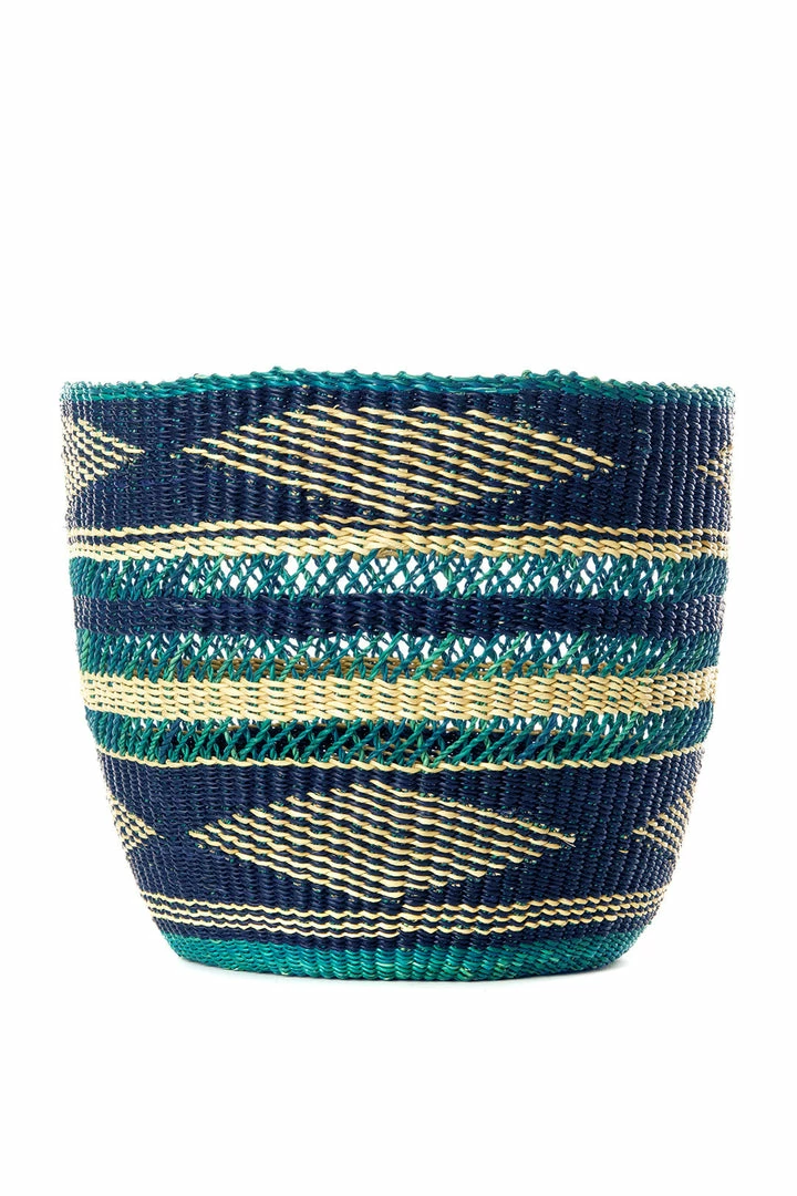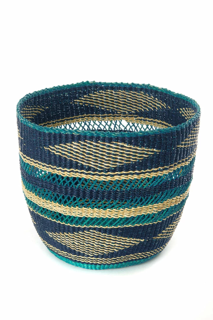 This beautiful open weave bin makes a lovely addition to the home. Handmade from stiff elephant grass dyed in dark blue and teal tones, the basket showcases the weaving talent of rural artisans in Northern Ghana, West Africa.