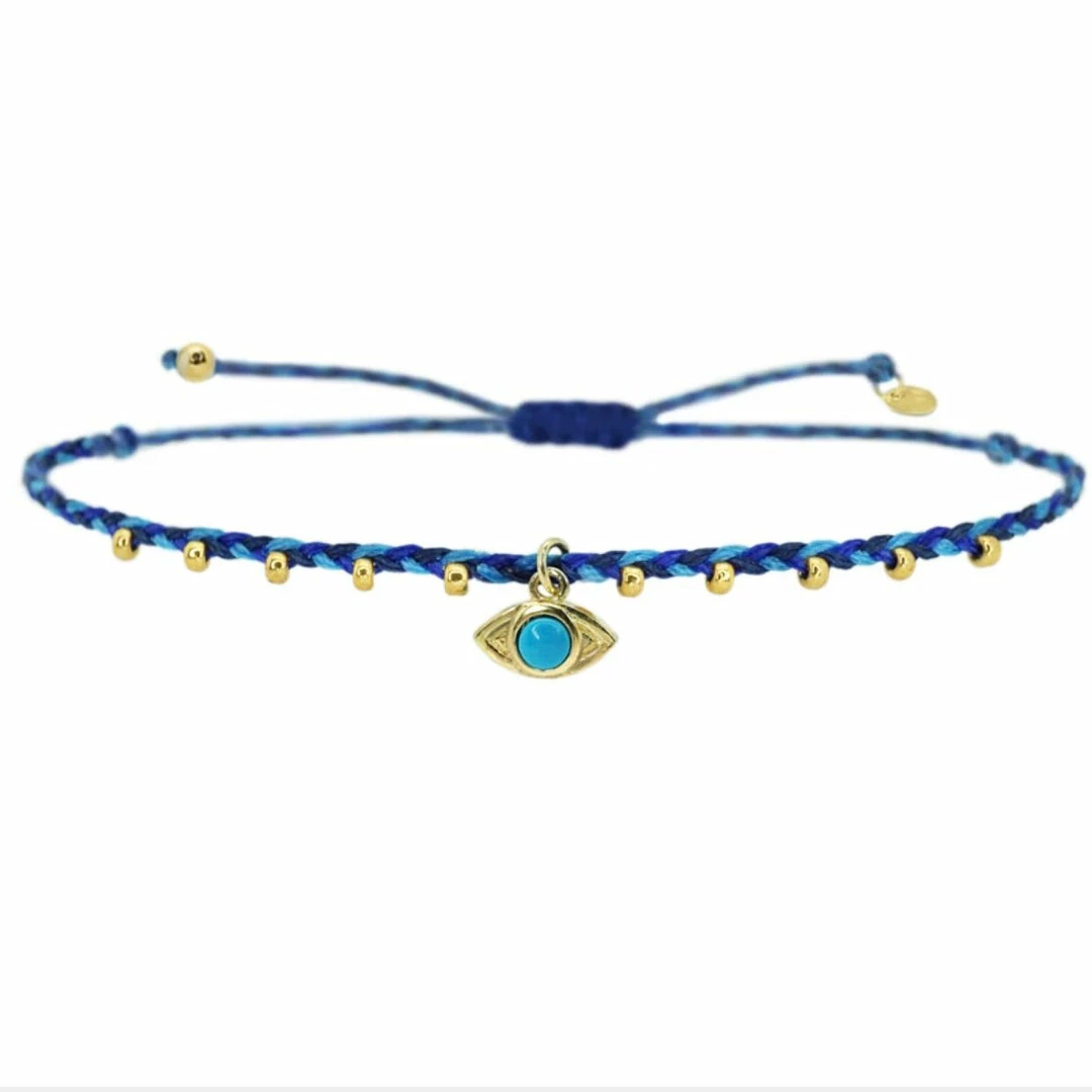 Angel Evil Eye anklet with a single gold plated evil eye pendant attached to blue threaded anklet with malachite beads. Each item is handmade and unique, may have slight variations.