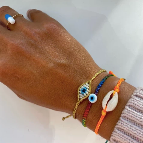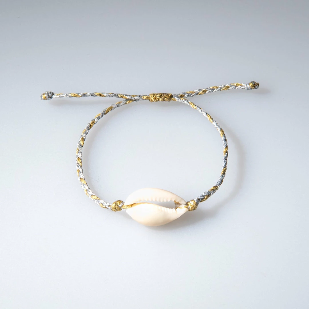 Braided Cowrie Shell Bracelet with a single shell attached to a duo color wax-coated cord. Each item is handmade and unique, may have slight variations.