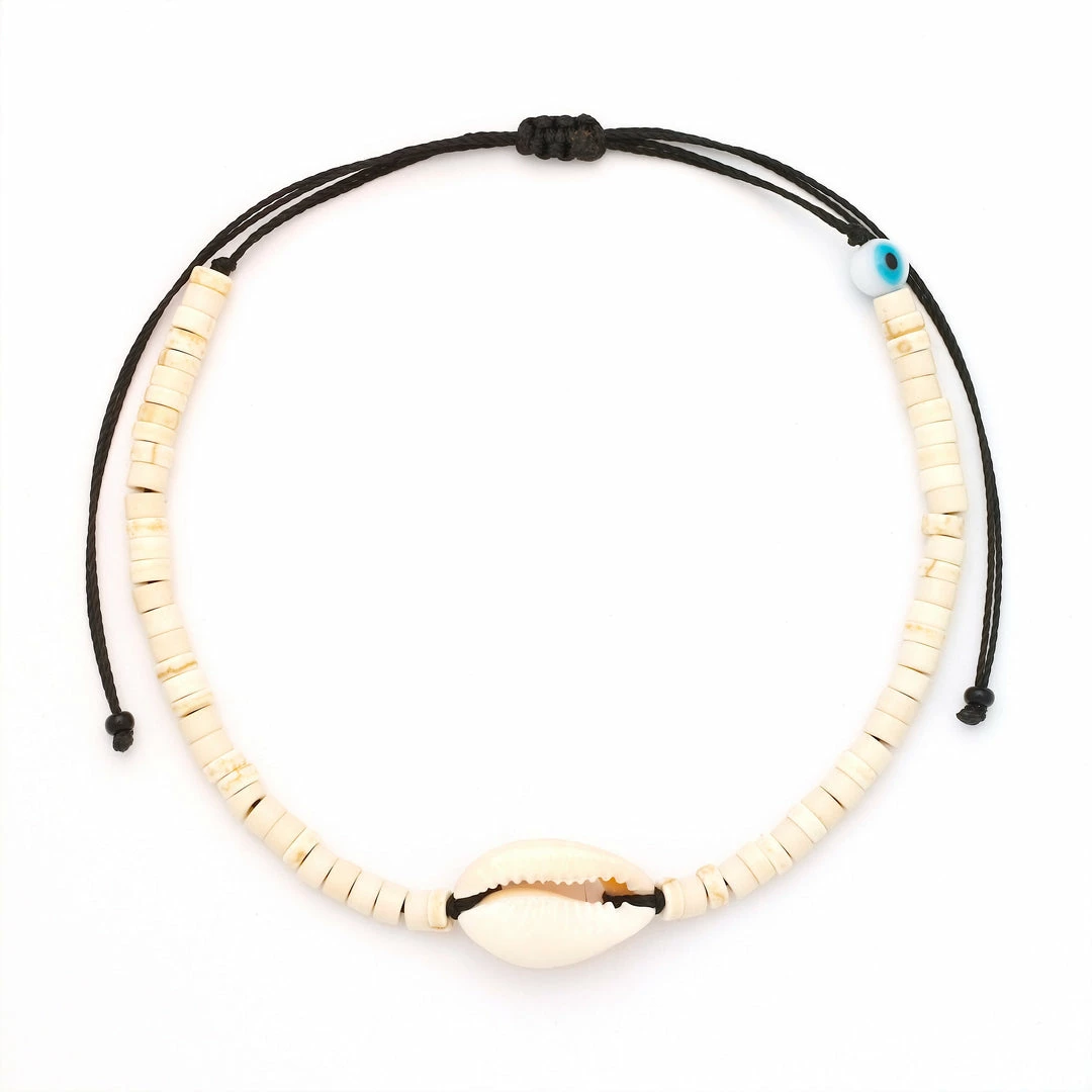 single evil eye bead and cowrie shell attached to cream colored beads with a sliding clasp. Each item is handmade and unique, may have slight variations.