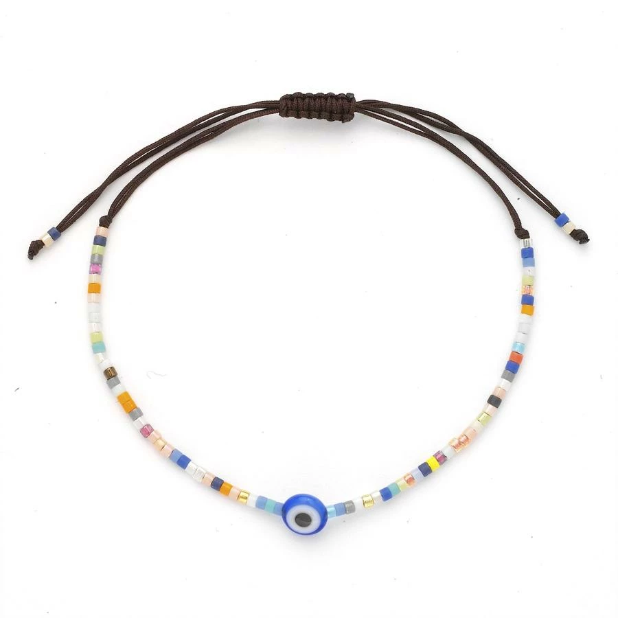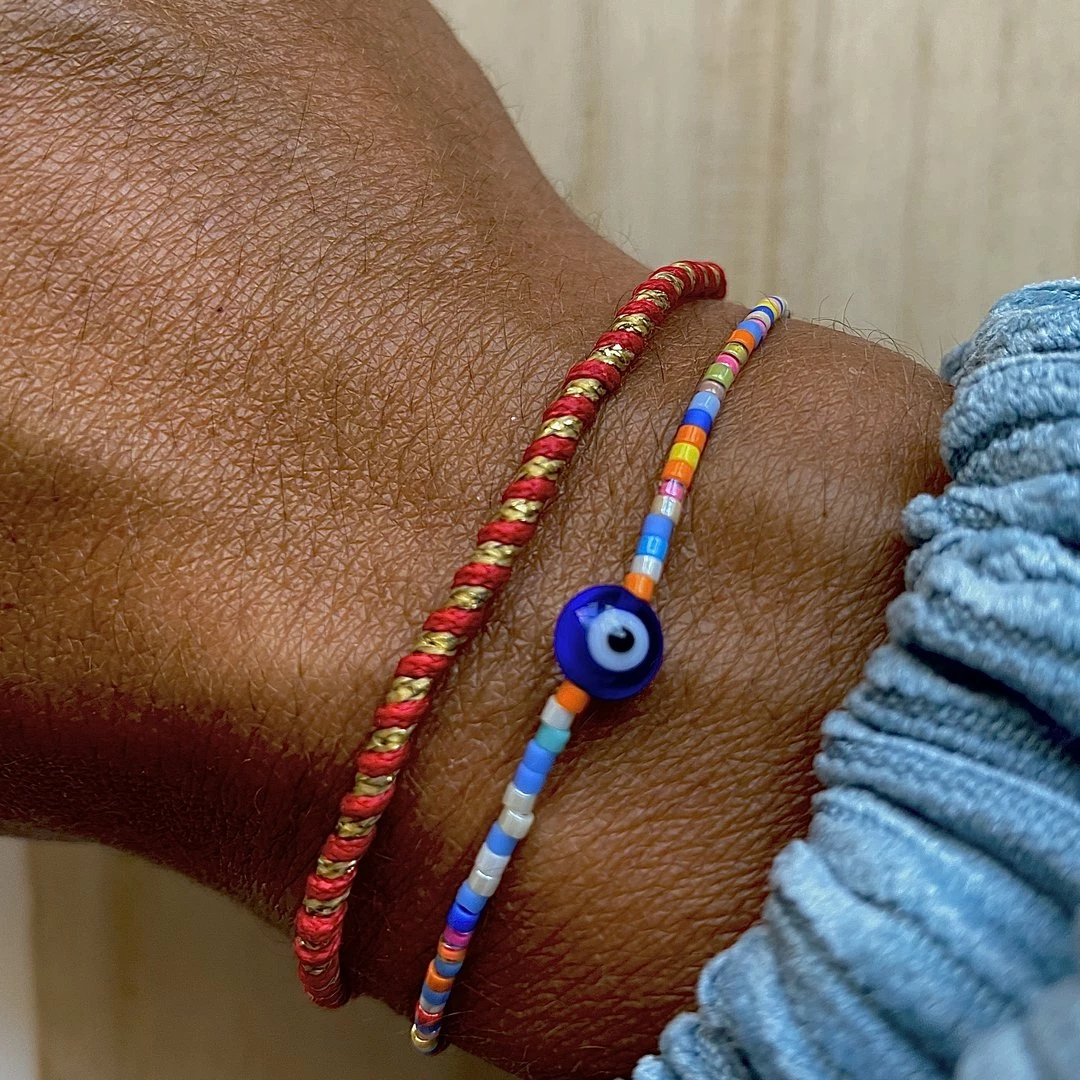 Evil Eye Thread Bracelet with a single evil eye pendant on a multicolored beaded bracelet. Each item is handmade and unique, may have slight variations.