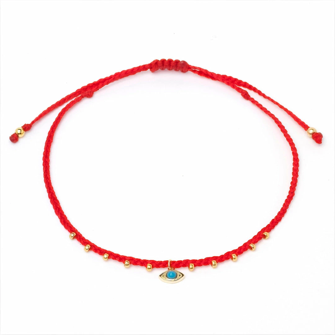 heather Evil Eye Anklet with a single gold-plated evil eye turquoise bead pendant attached to a red threaded anklet with malachite beads. Each item is handmade and unique, may have slight variations.