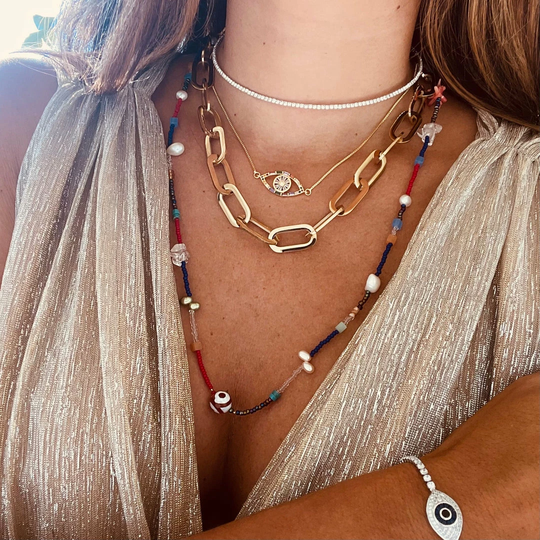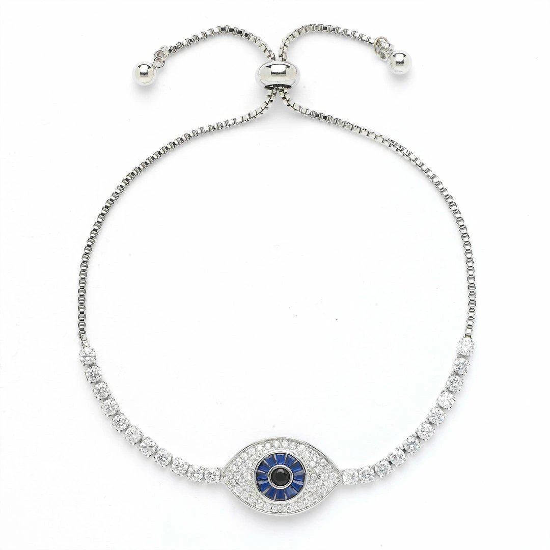 rhinestone-studded evil eye with a blue pupil attached to a silver plated bracelet. Each item is handmade and unique, may have slight variations.