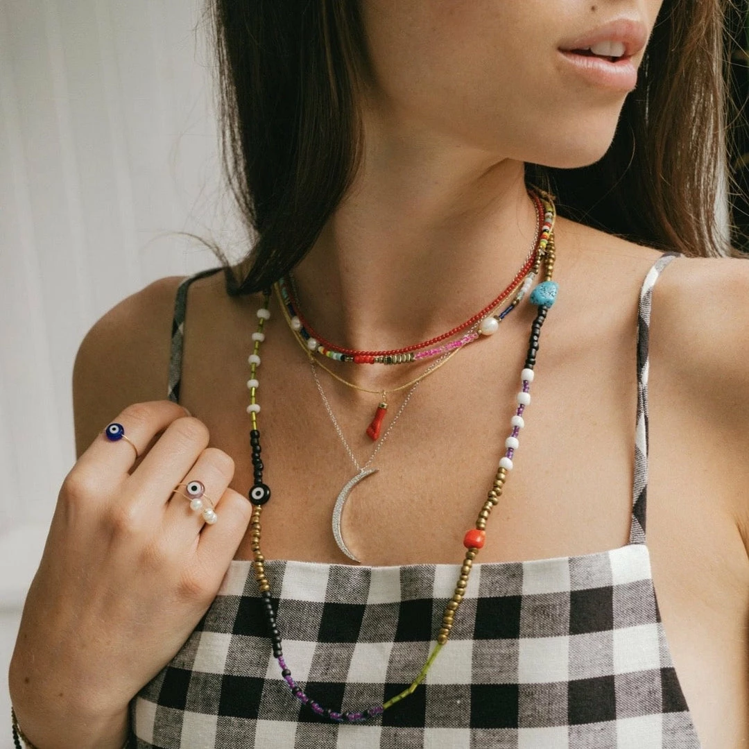 Jessica Pearl Beaded Choker with a mix of colorful beads and pearls. Hardware is brass. Each item is handmade and unique, may have slight variations