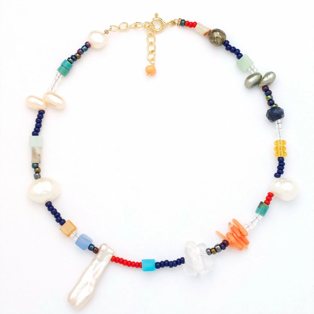 Johanna Pearl & Gem Anklet is a multicolor beaded anklet with freshwater pearls, an assortment of gemstones, and a painted evil eye pendant with a lobster claw clasp. Each item is handmade and unique, may have slight variations.