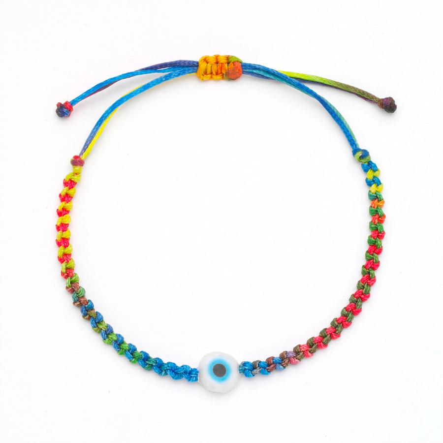 Kids Rainbow Braided Evil Eye Bracelet with rainbow braided bracelet and a single evil eye pendant. Each item is handmade and unique, may have slight variations.