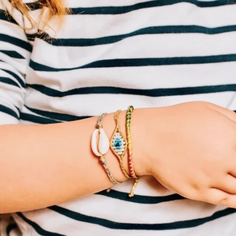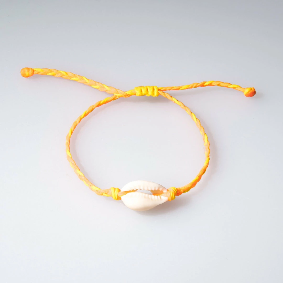 Kids Braided Cowrie Shell Bracelet with a single cowrie shell attached to a multicolored threaded bracelet. Each item is handmade and unique, may have slight variations.