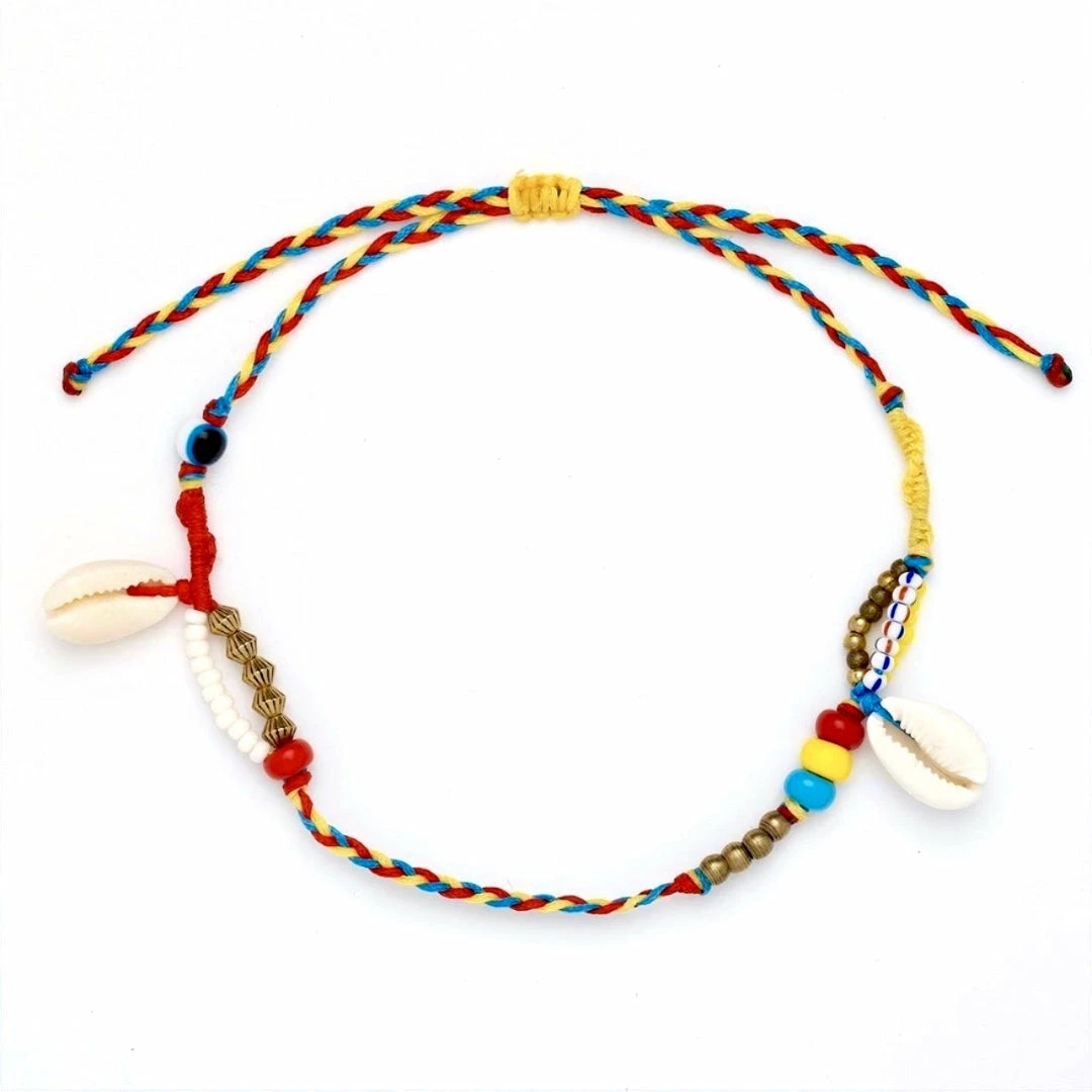 wo cowrie shells, an evil eye bead, and bronze and white beads attached to a multicolored threaded anklet. Each item is handmade and unique, may have slight variations.