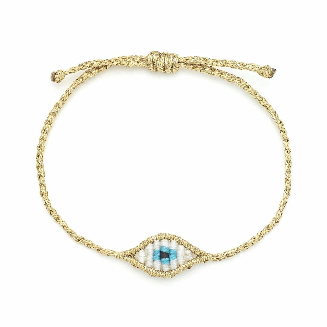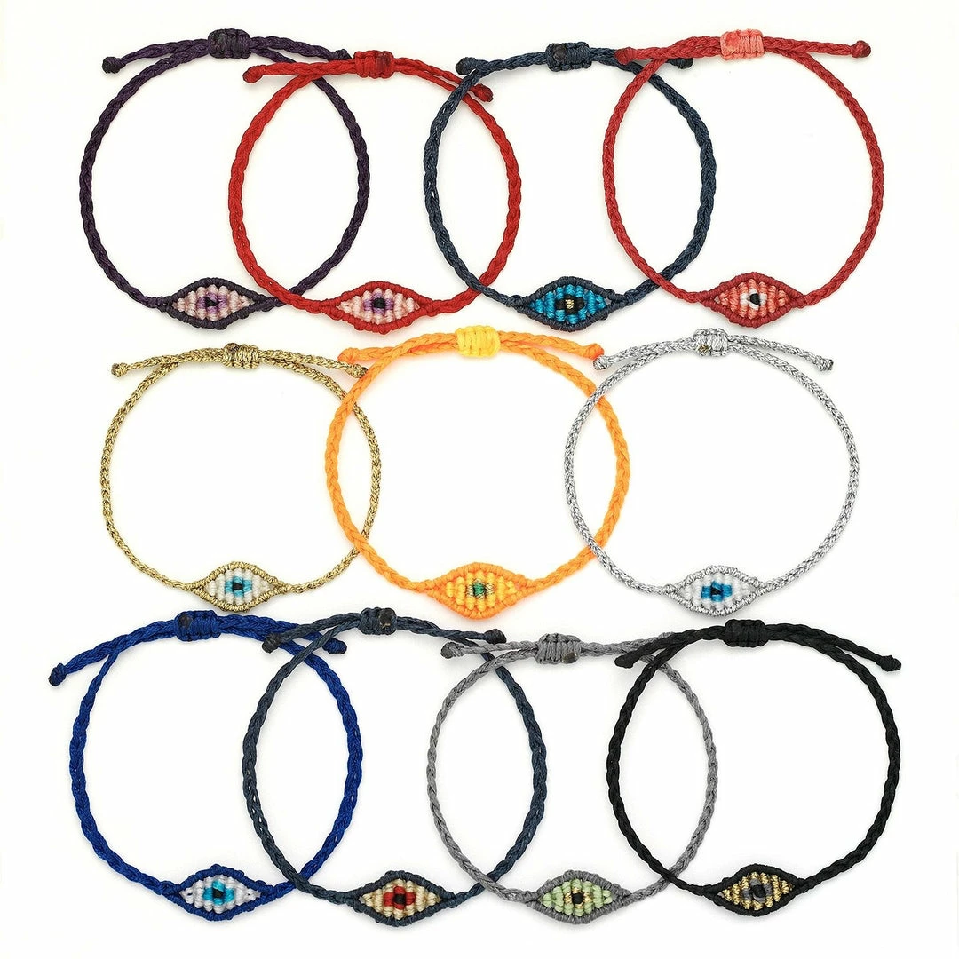 Small Evil Eye Bracelet on a wax-coated bracelet. Each item is handmade and unique, may have slight variations.
