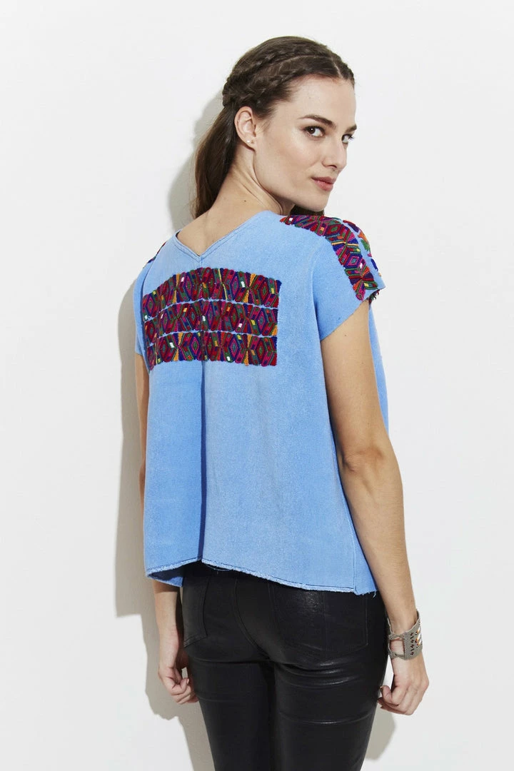 Vintage blouse woven on a traditional back strap loom by a Maya women from Guatemala. Made of cotton, similar to a sweatshirt. In Spanish is called huipil and has been worn by Mayan woman for centuries. The weave or design of each huipil can identify her individual personality and the village she is from, as well as her marital, social, wealth, and religious status. The patterns and meanings on the huipil have remained the same over the years since the ancient Maya civilization. The designs are created by weaving colored yarns into the cloth as it is being woven. The process is called brocade, which is different than embroidery where the threads are stitched into the completed garment. The weaver sometimes will use natural dyes, such as flowers, plants, insects, bark, or berries. When a huipil is finished it is a work of art and can sometimes take months to complete.