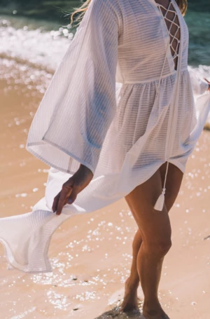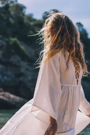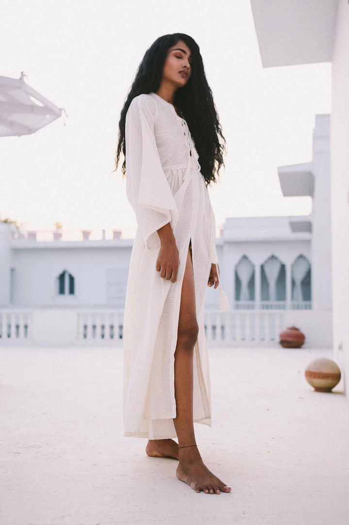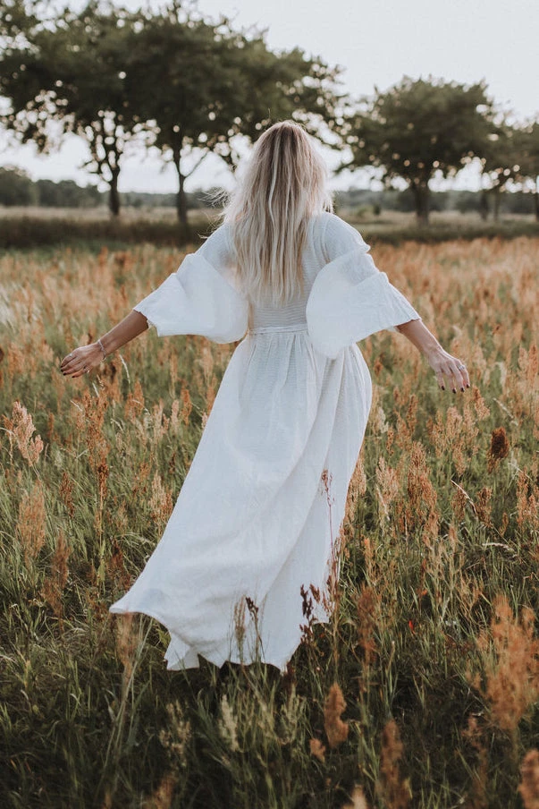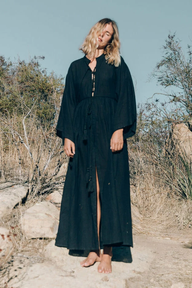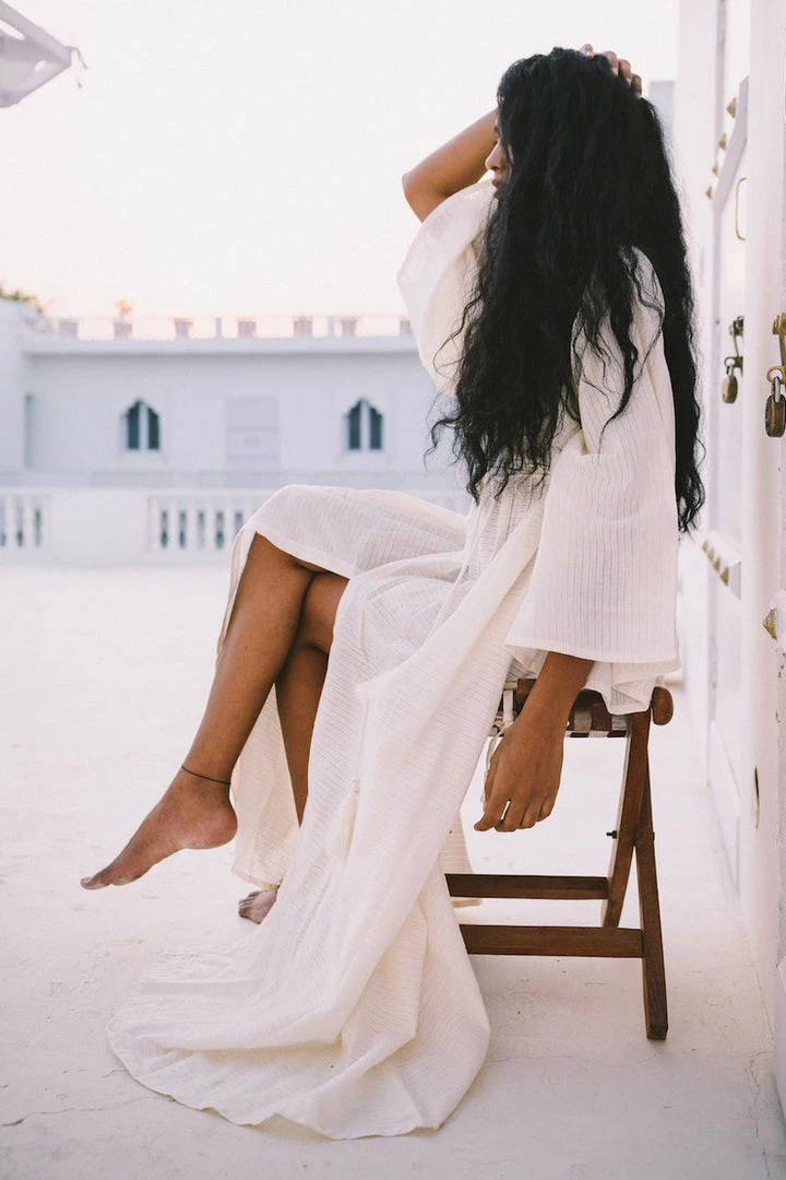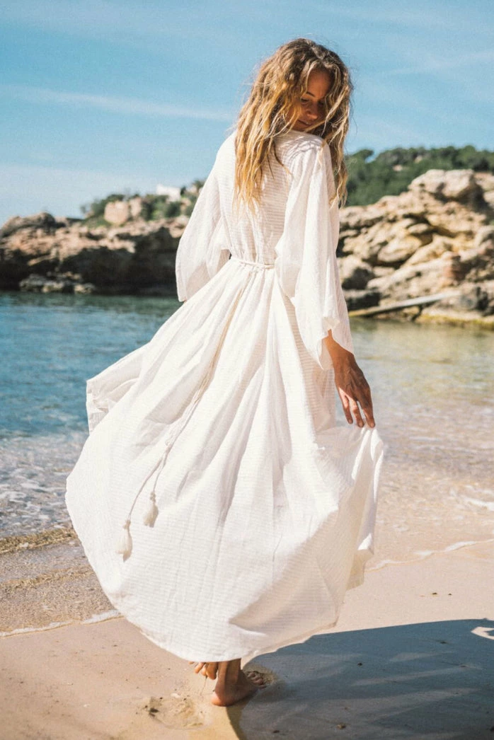 Sayulita is a romantic signature dress encompassing everything “a perfect nomad” should be. Crafted from natural handwoven cotton and shaped with a sultry deep criss cross V-neck, front slit, a delicate tassel waist tie and soft bell sleeves. This dress is delicate and effortlessly carefree.Â