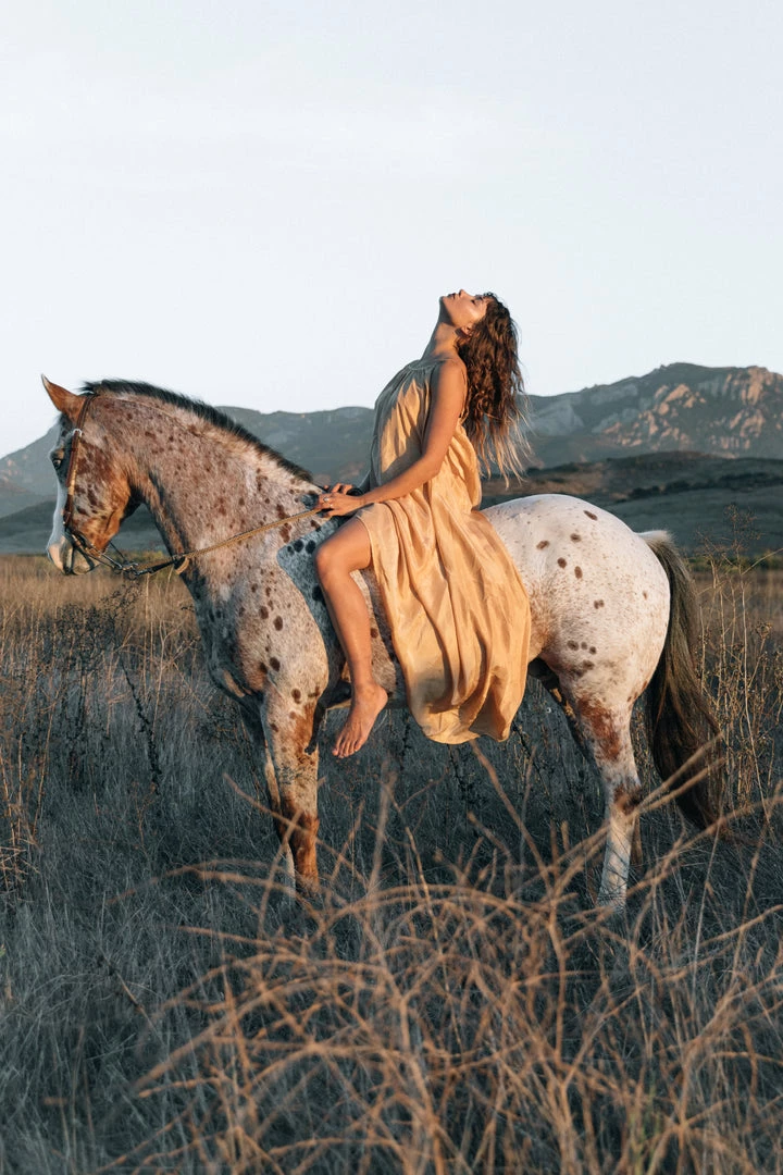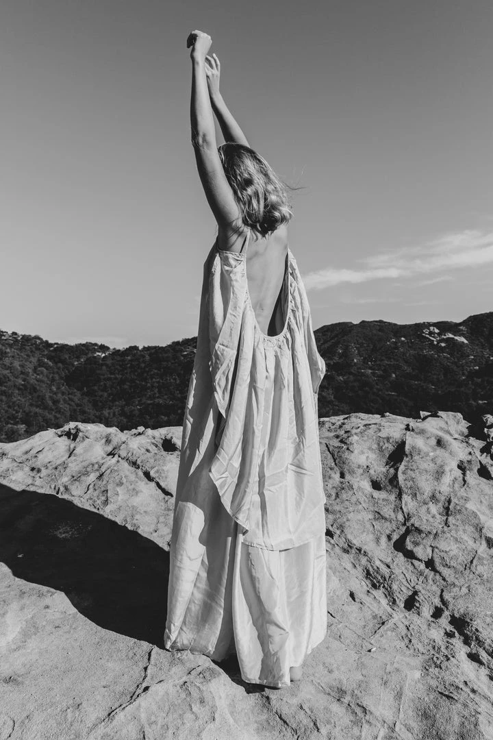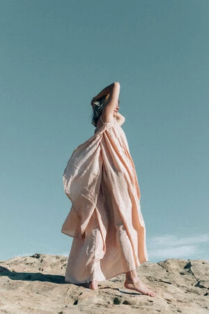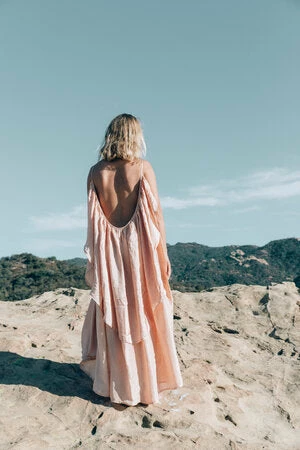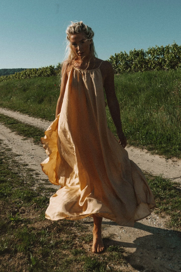 The floaty Syros has been hand dyed in a golden palm green for the ultimate go to statement dress. Bohemian and luxurious to take you effortlessly from the beach into the evening year after year. Nomadic locations inspire the natural textures and elegantly dramatic silhouettes that define our collections. This style has been hand made in India cut from 100% organic silk that falls loosely to a floor-sweeping tiered hem with ultra low back. Â