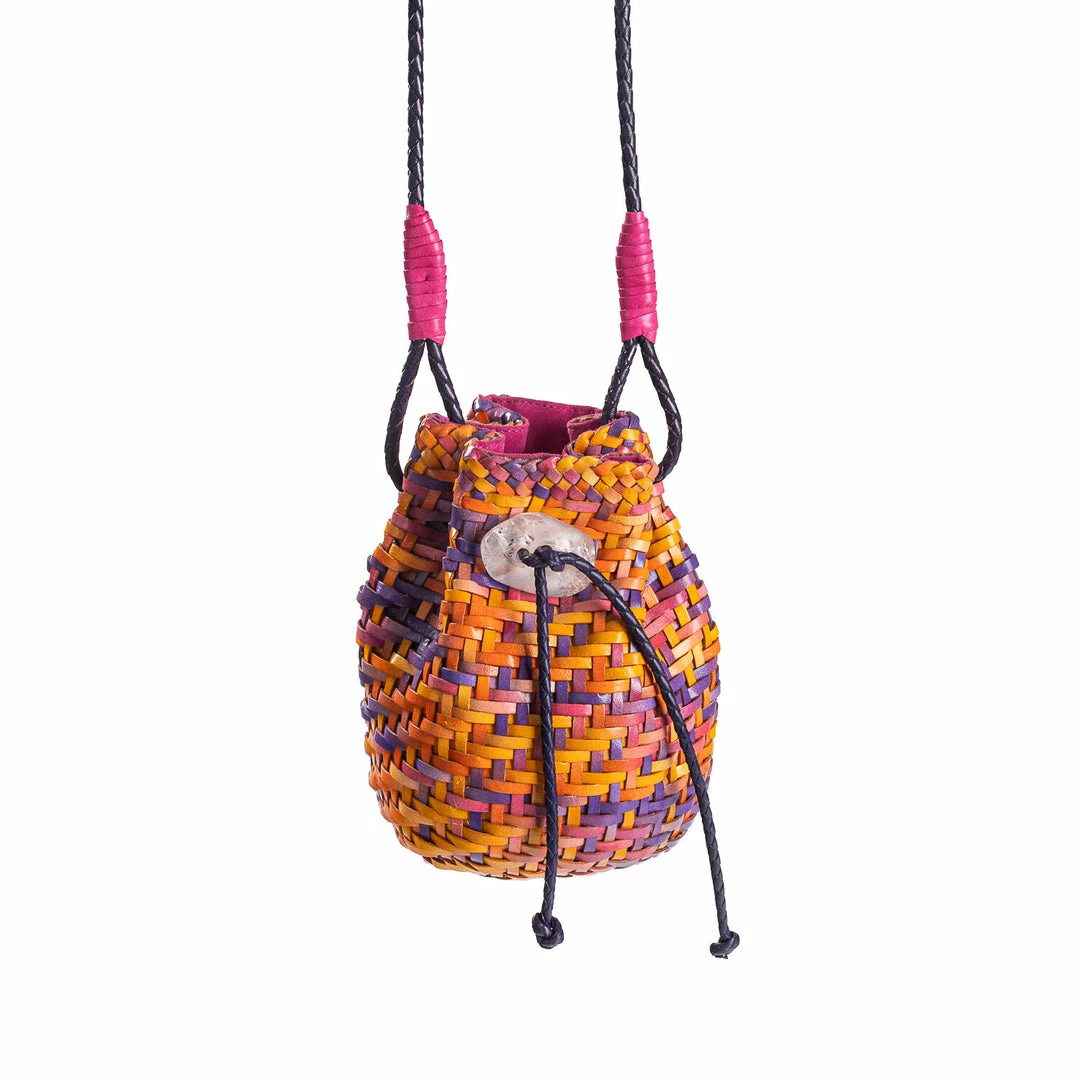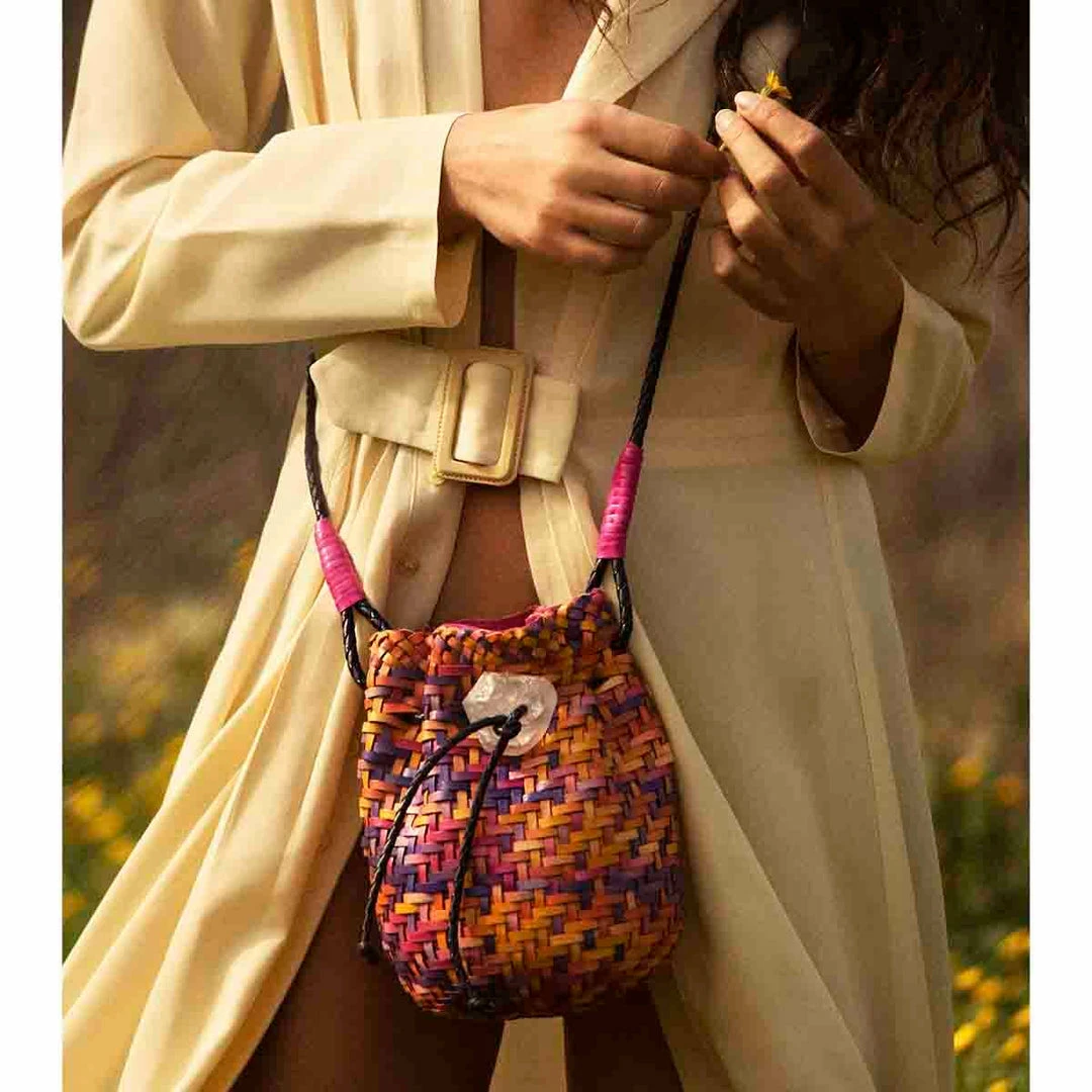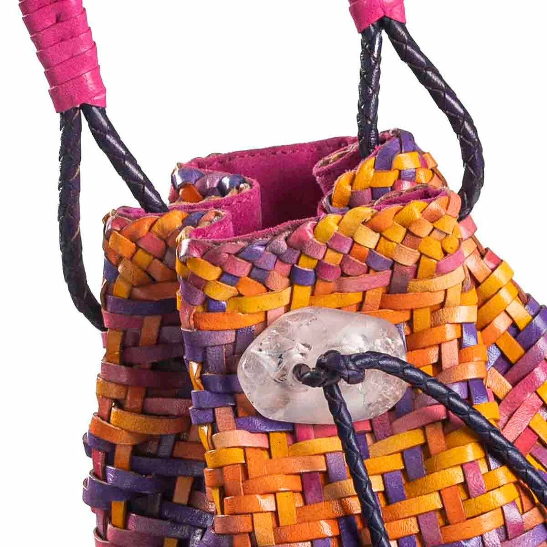 Nirmala Handwoven Multicolor Tie Dye. The Nirmala bucket bag is Iacobella’s signature creation. It’s handwoven in multicolor vegetable-tanned leather, and is embellished with a QUARTZ CRYSTAL stone that doubles as an enclosure. The straps are long enough to be worn on the shoulder or as a crossbody.