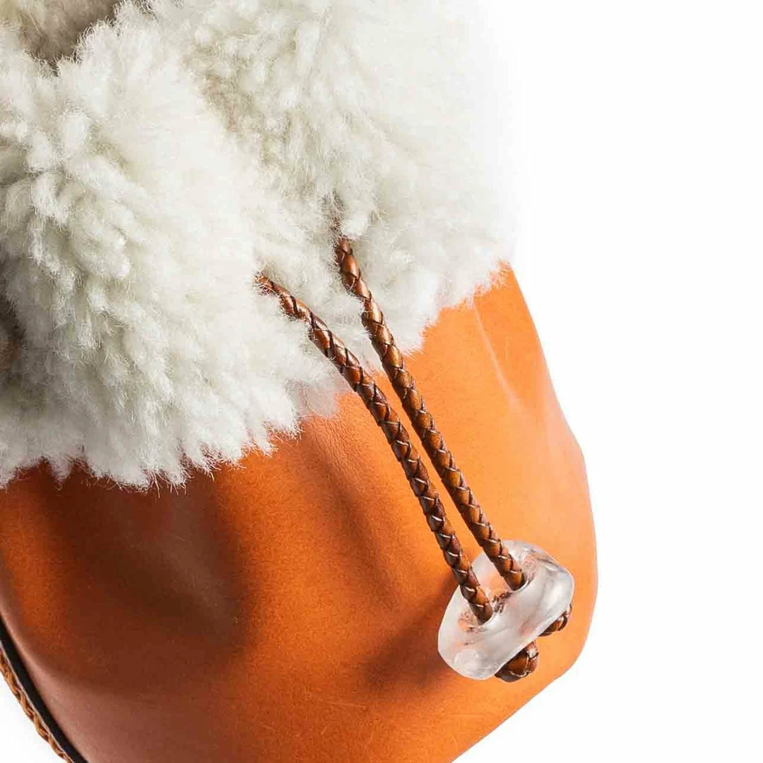 Orange Vegetable Tanned leather and Shearling. TheĀ Nirmala bucket bag isĀ Iacobella’sĀ signature creation.Ā Itās embellished with a crystal quartzĀ Ā that doubles asĀ an enclosure. This version is made from vegetable tanned leather and trimmed with plush shearling. It isĀ accompanied with an interior leather pocket, and the straps are longĀ enough to be worn on the shoulder or as a crossbody.