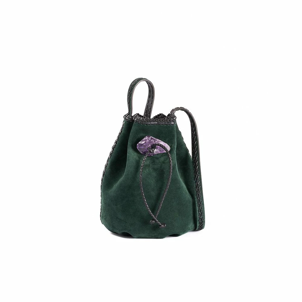 The Nirmala bucket bag is Iacobella’s signature creation. It’s embellished with a crystal or stone of your selection that doubles as an enclosure. It is accompanied with an interior leather pouch, and the straps are long enough to be worn on the shoulder or as a crossbody.