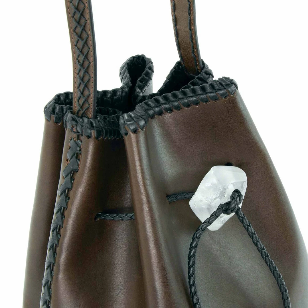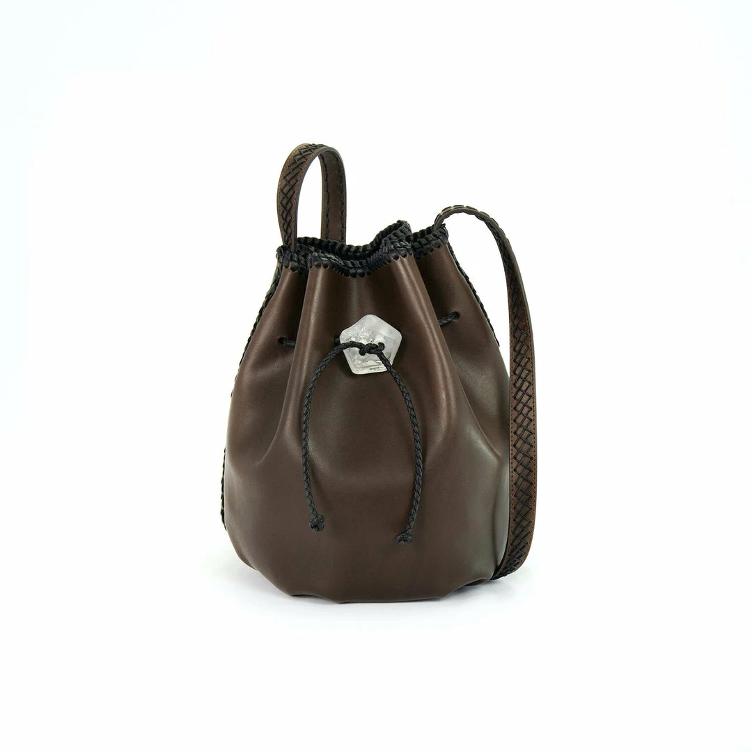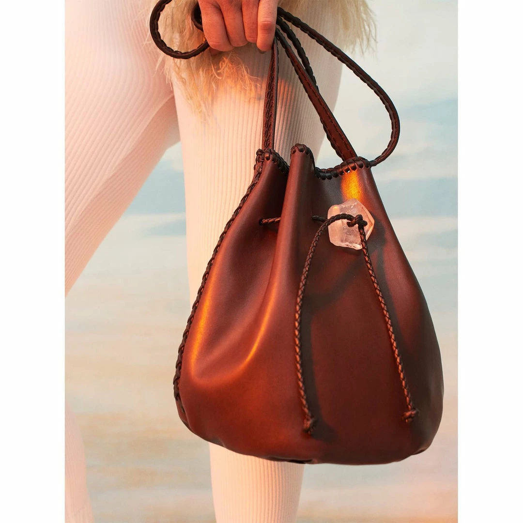 The Nirmala bucket bag is Iacobella’s signature creation. It’s created in vacchetta leather and embellished with a crystal that doubles as an enclosure. The straps are long enough to be worn on the shoulder or as a crossbody.