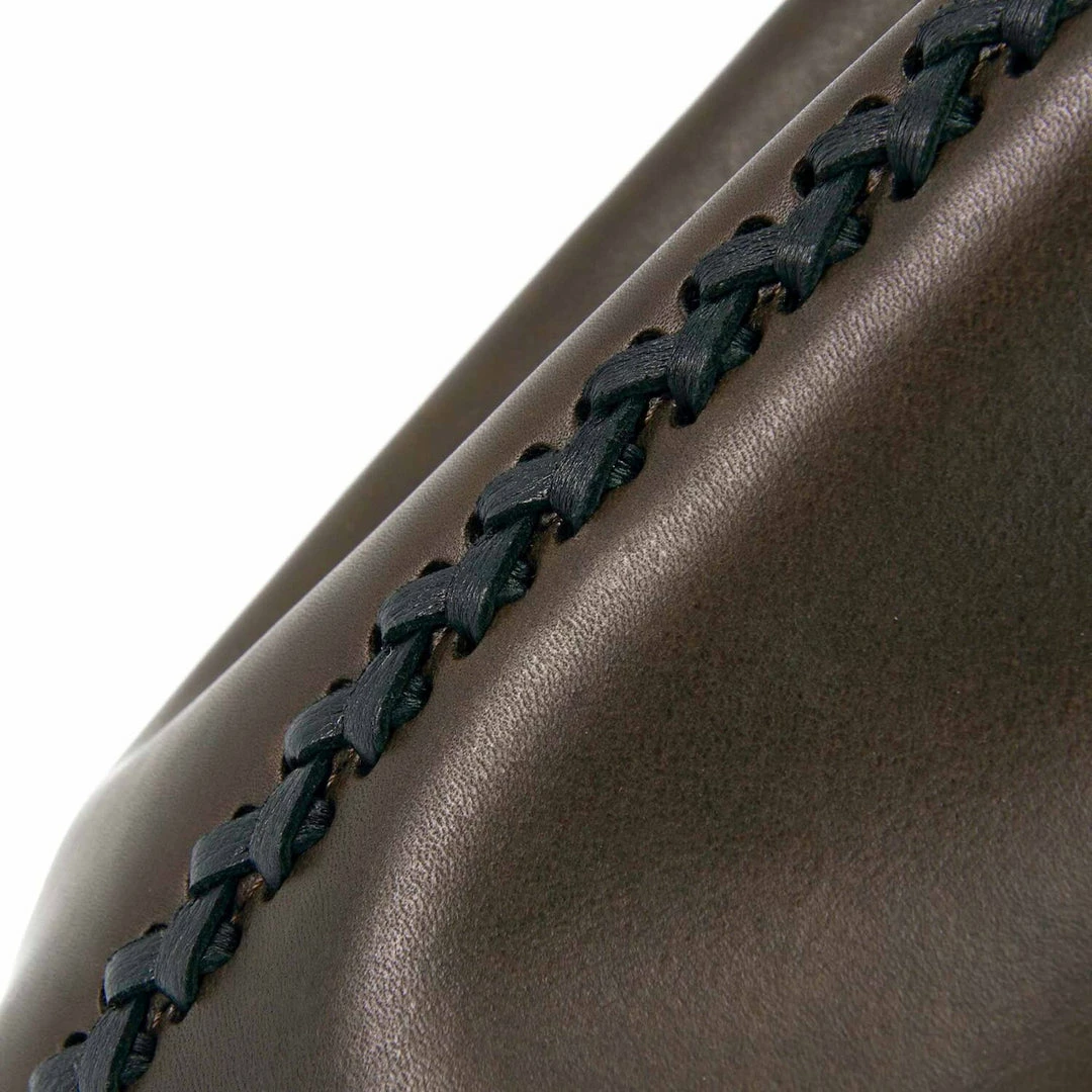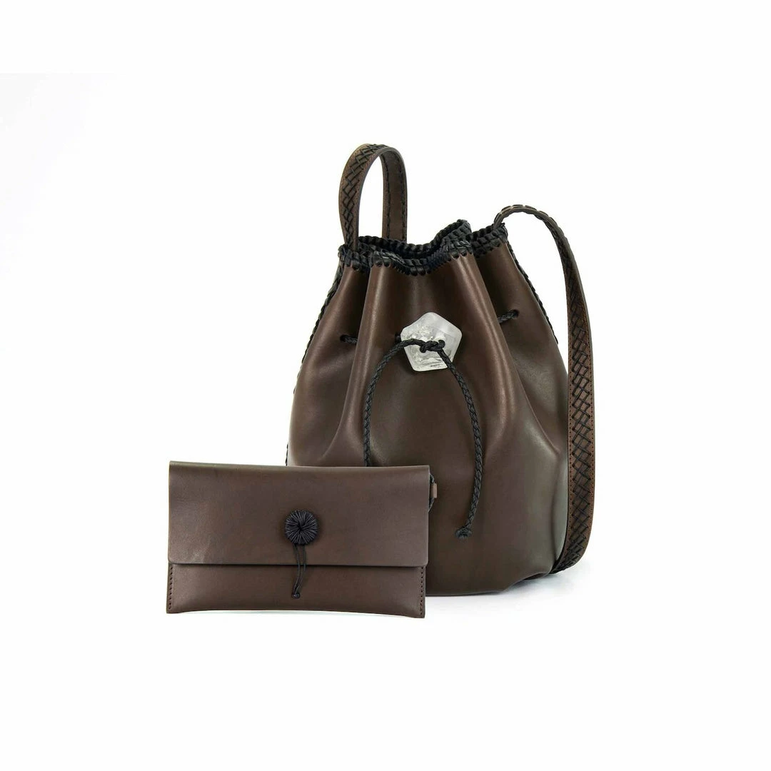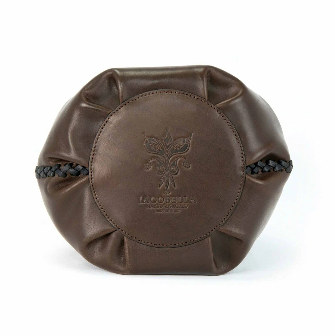 The Nirmala bucket bag is Iacobella’s signature creation. It’s created in vacchetta leather and embellished with a crystal that doubles as an enclosure. The straps are long enough to be worn on the shoulder or as a crossbody.