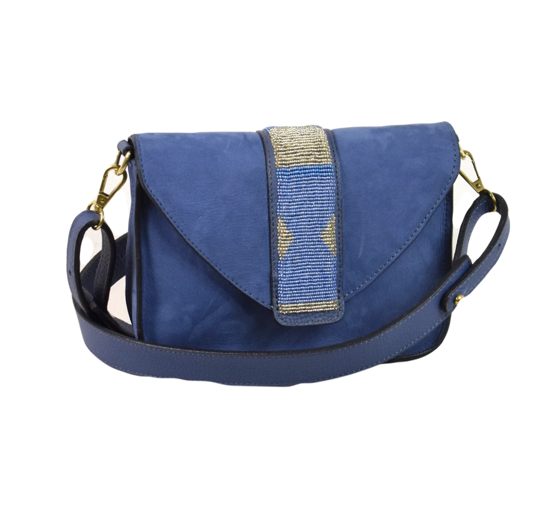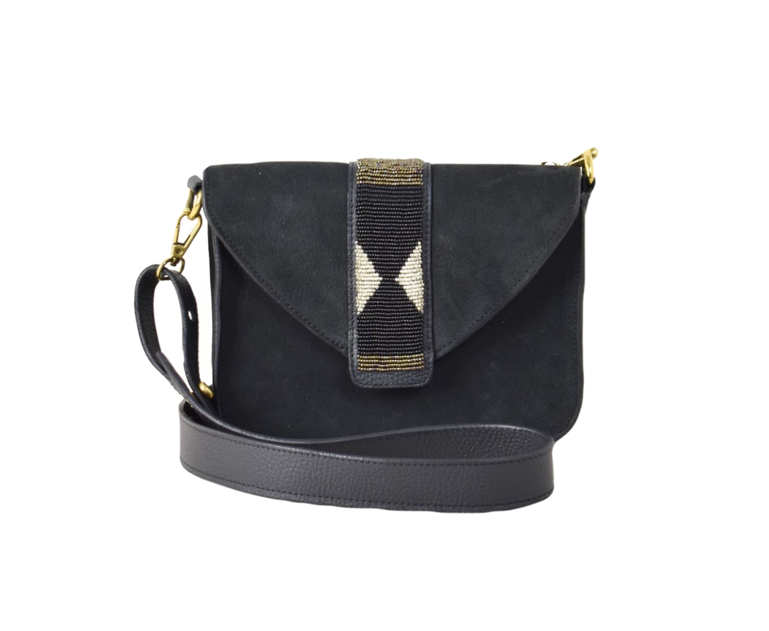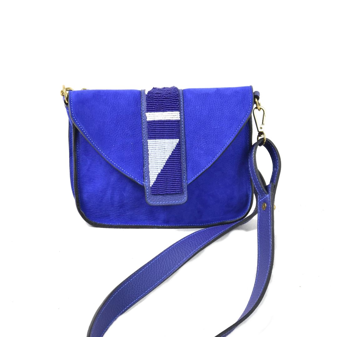 One of the latest bag in the Bush Princess collection. Its beaded work designed by their team of Maasai women make Rue du Dragon unique and elegant. It is lined with Chambray material and features a long detachable shoulder strap, and an inside zipped pocket.