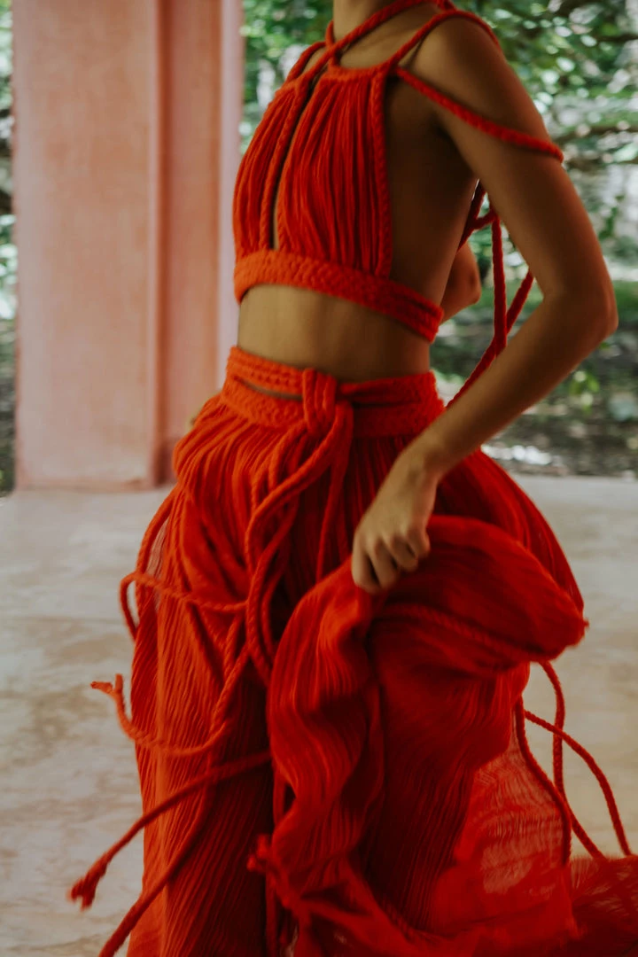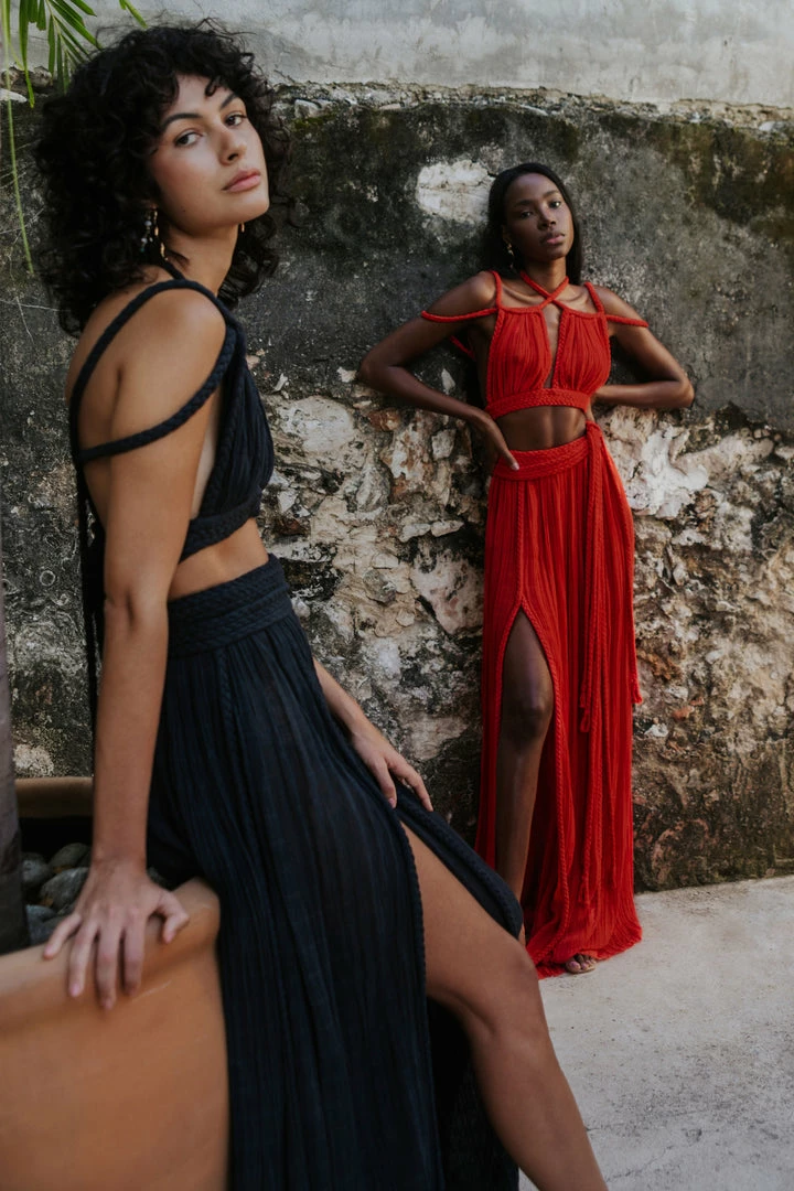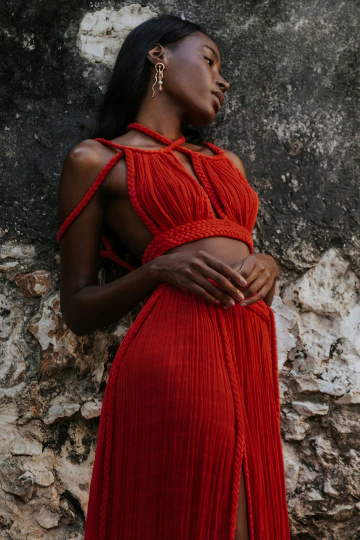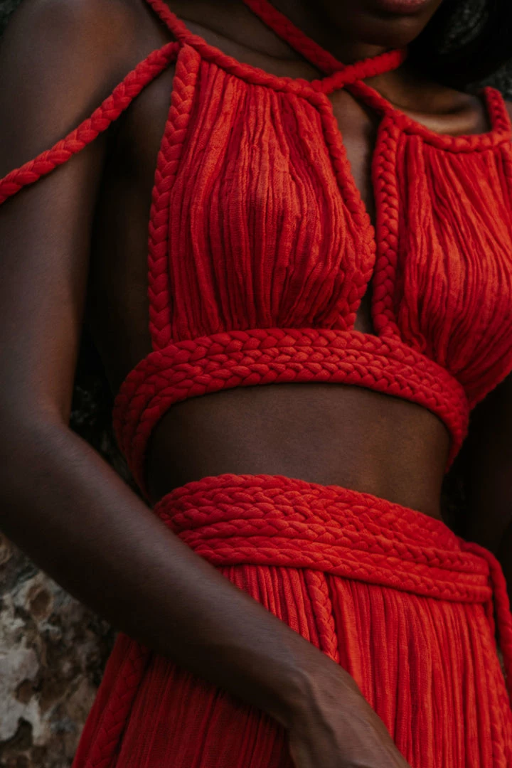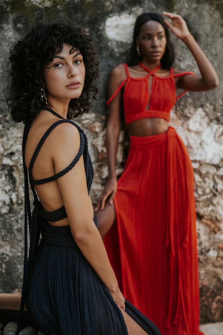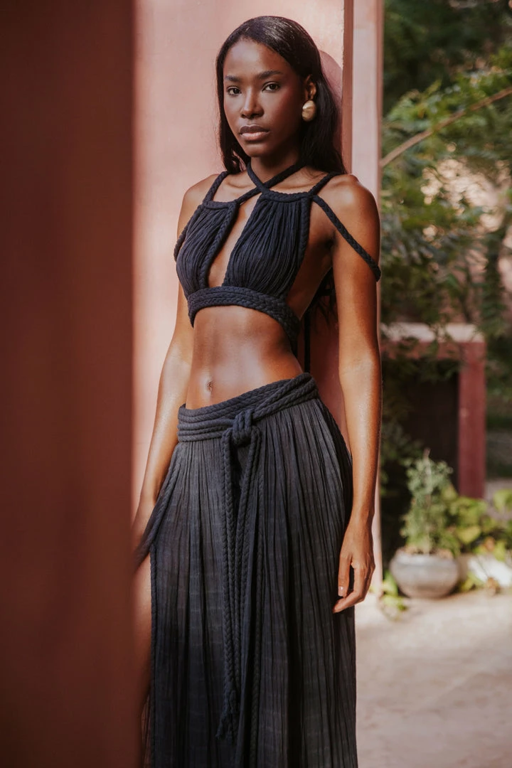 Kasia’s best-selling Aphrodite Gown is now available in a two-piece set! Worn together or separate, this fun + flirty design features a crop top with braided neckline details that can be worn in many variations. An alluring open back and delicate drop shoulder details. Anchored by three rows of handwoven braids, which slide easily to adjust for fit. The simple wrap skirt has a high side slit and is trimmed with our signature hand-braided detailing at each seam. Wrap braids to create different silhouettes and tie to close. Can be worn high at your waist or dropped to the hipline for a foxier look.