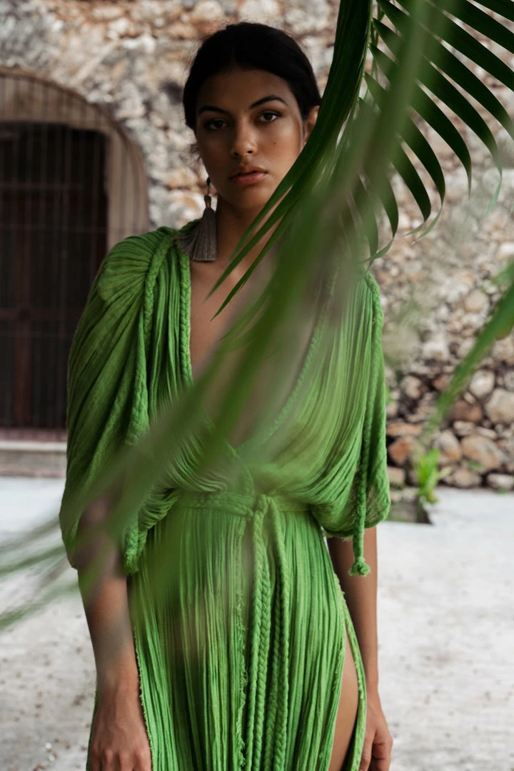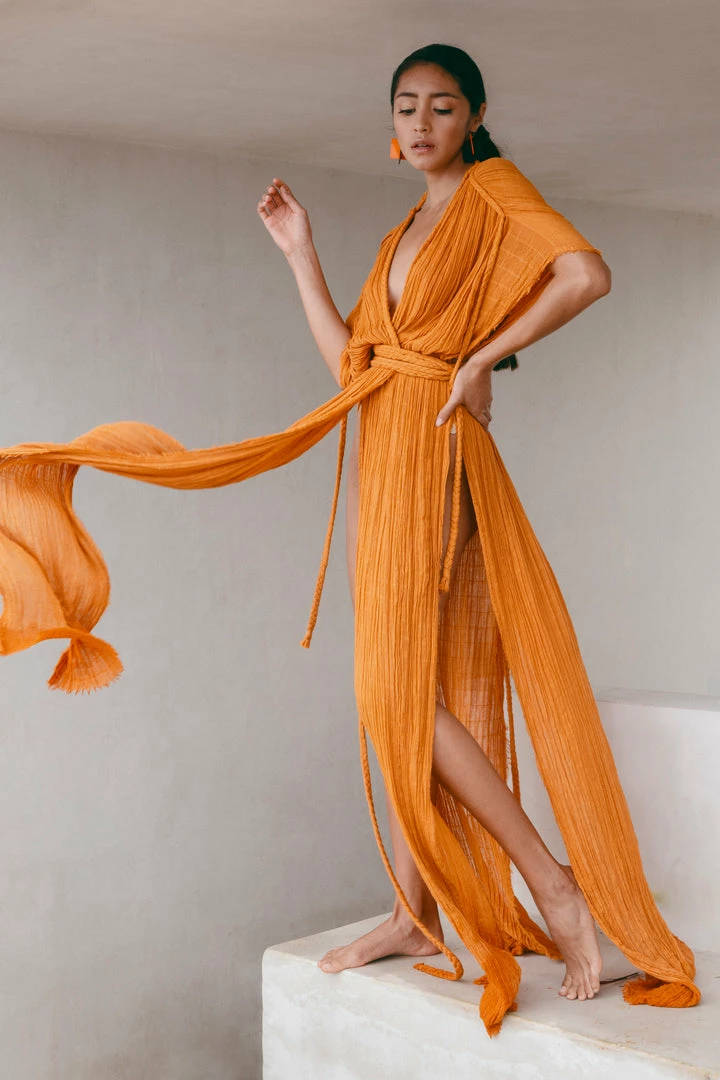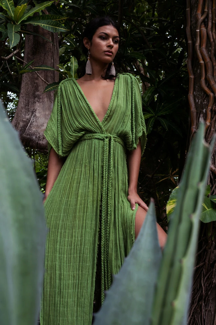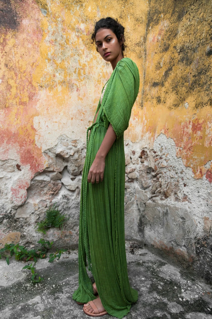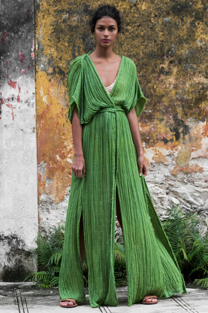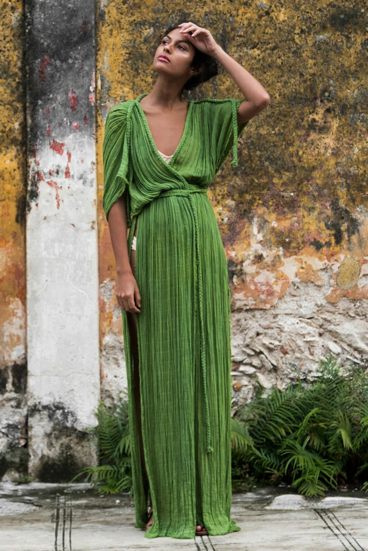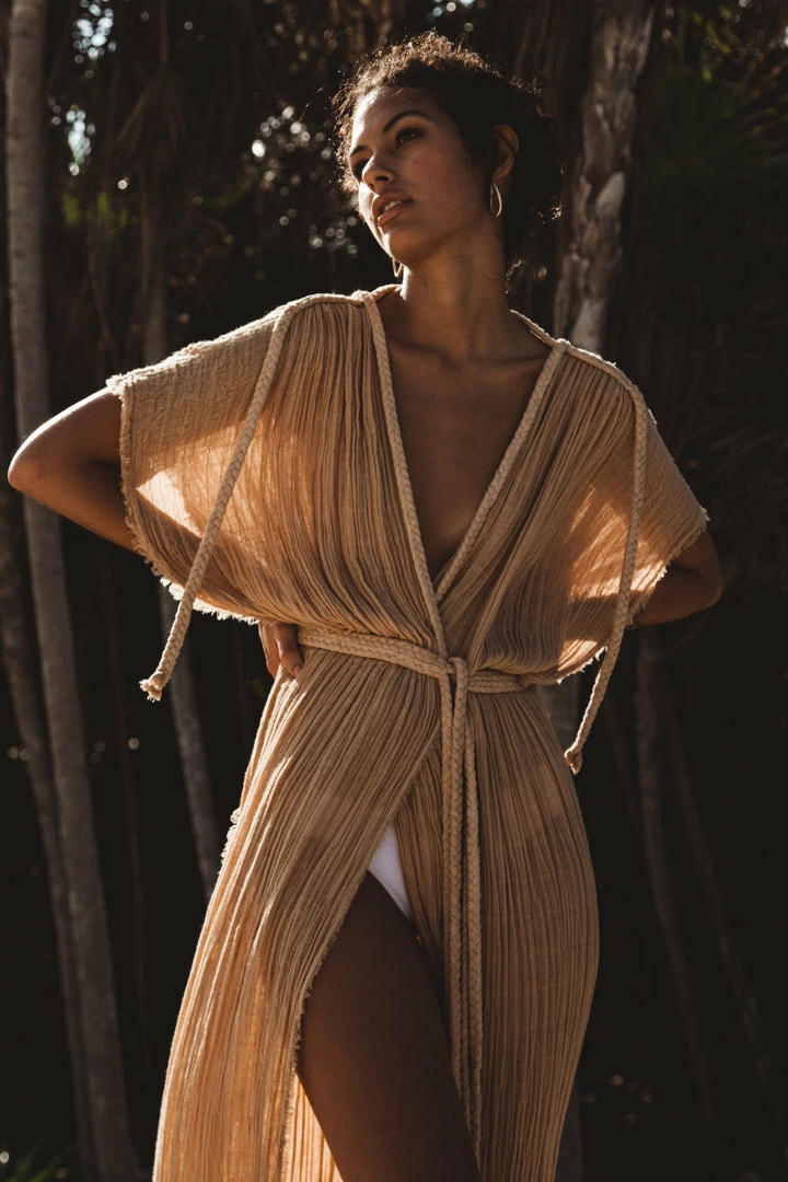 Aura Goddess Duster Gown with grecian draping and hand applied shoulder details. Generously trimmed waistline adorned with strings of hand braided ties. Free flowing open front silhouette transforms into an elegant and beautifully cascading gown.