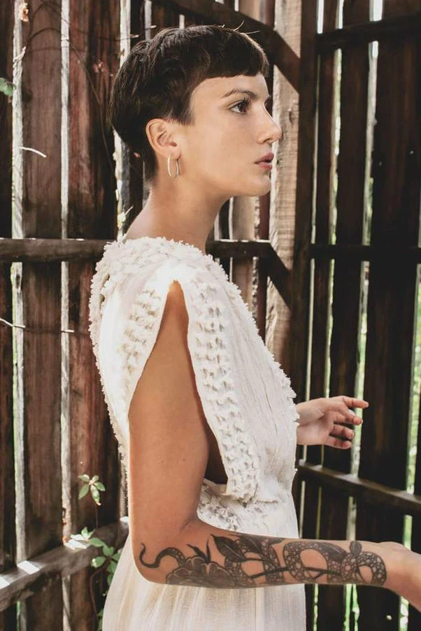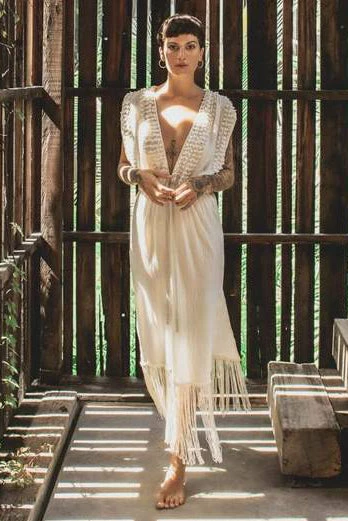 Innocence dress hand embroidered, and with silk and bamboo fringes. Handmade by artisans from remote communities in Mexico.Â