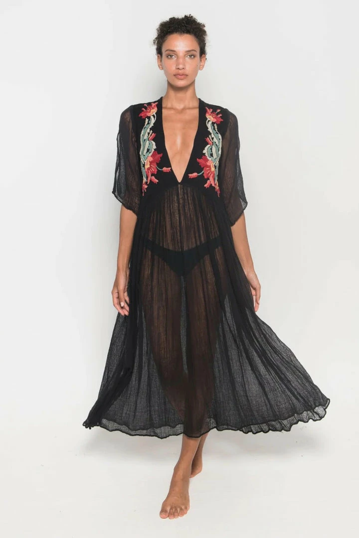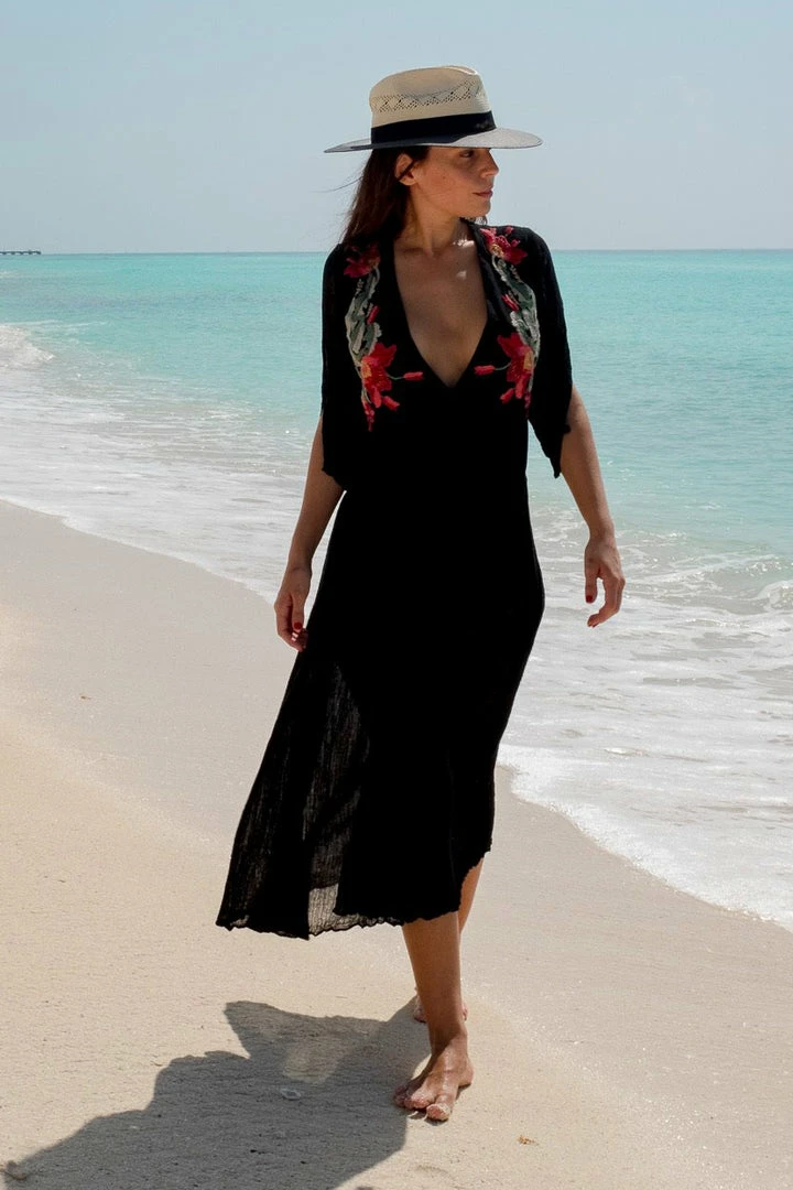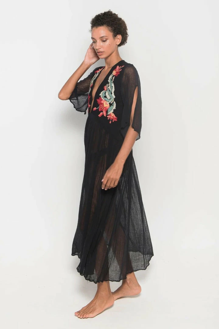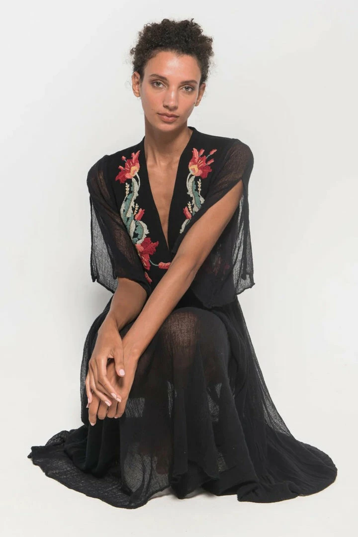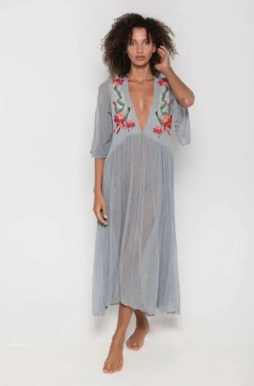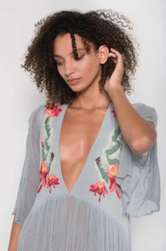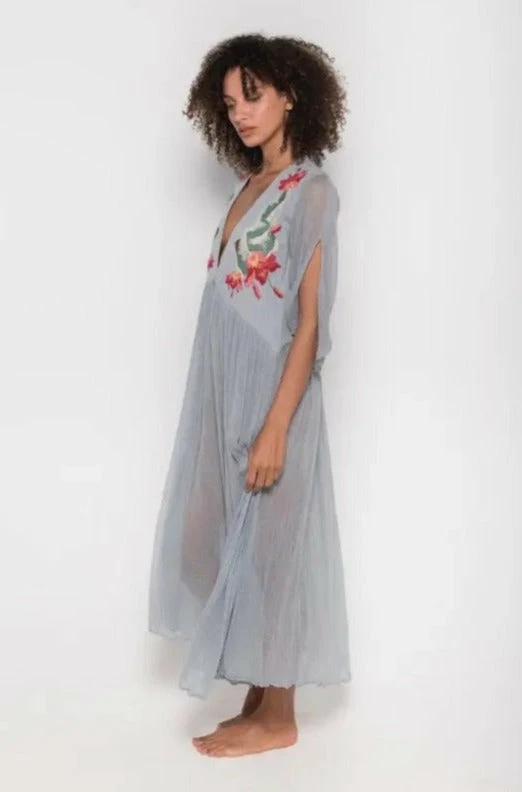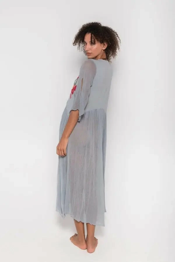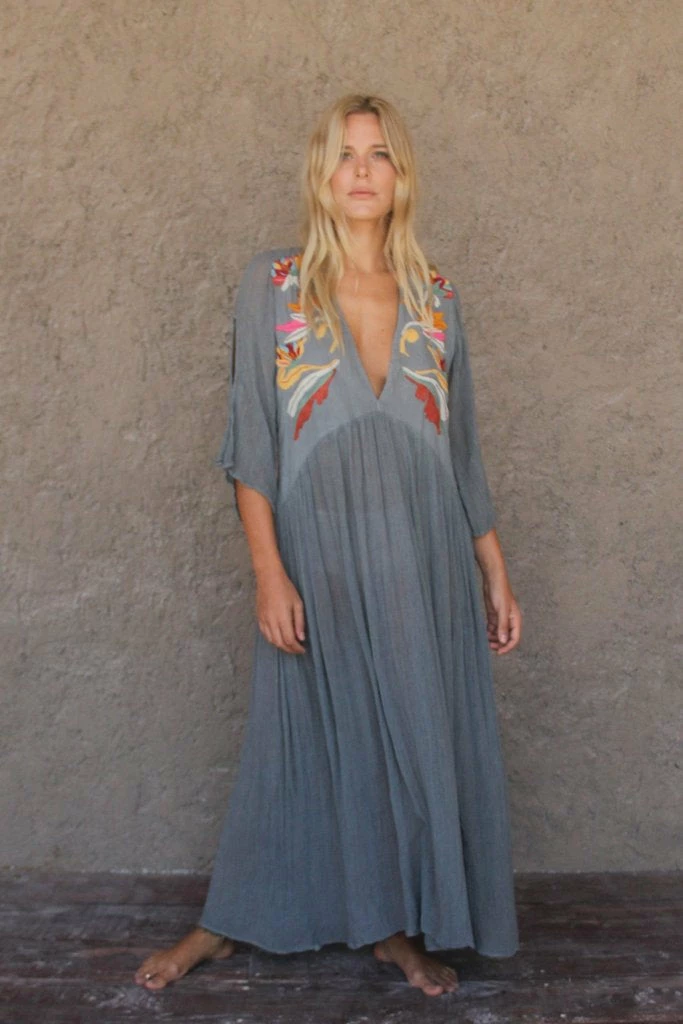 Iruya Deluxe long dress hand-dyed cotton in light bluish gray. V-neck with hand-embroidered details in cotton thread, made by artisans from remote communities in Mexico. 100% Cotton