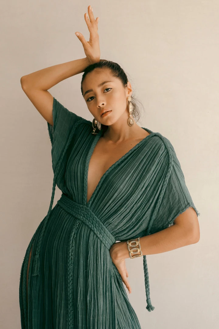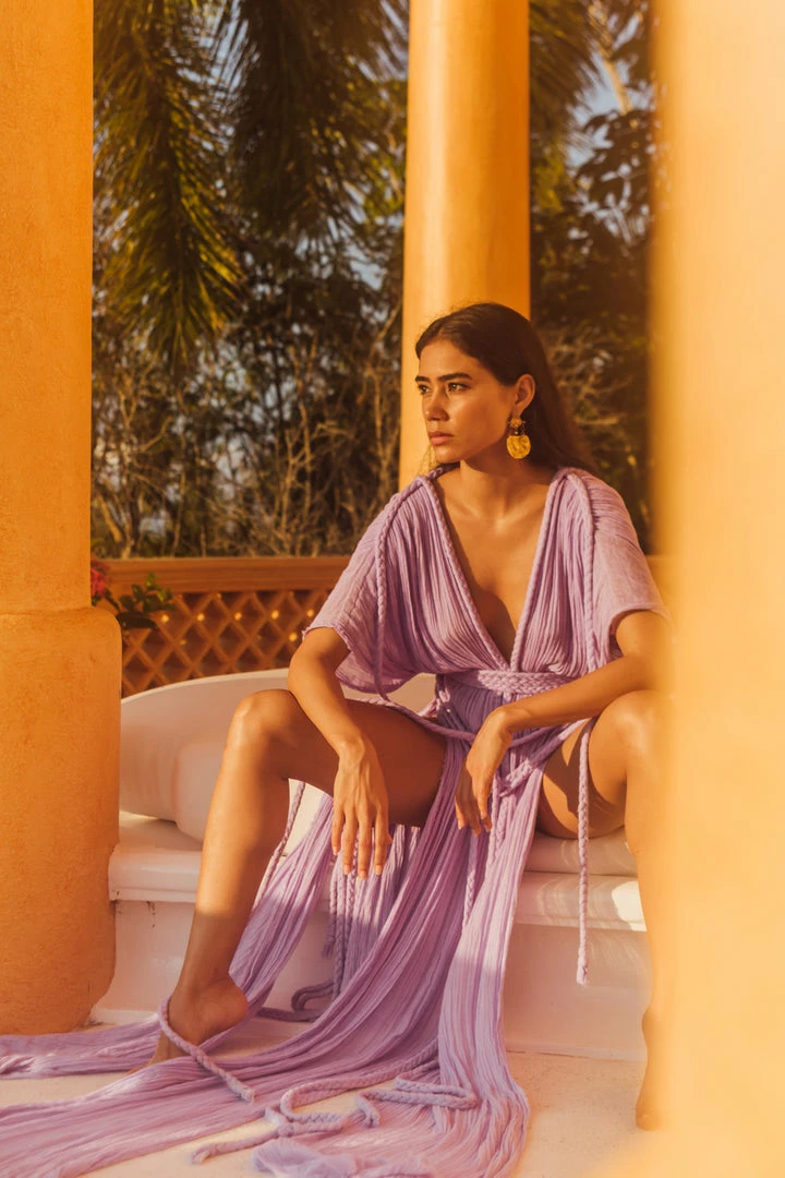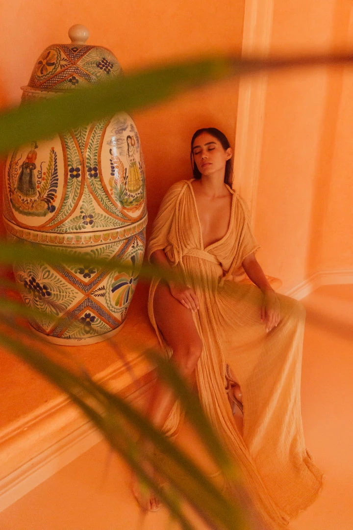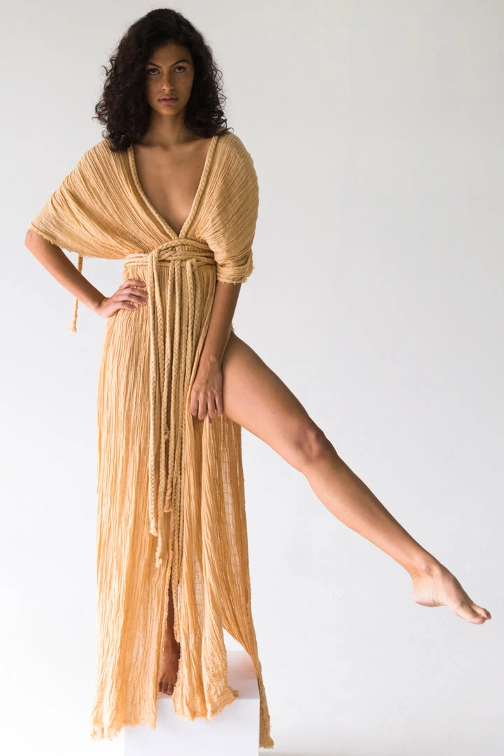 A sexy update to Kasia’s Signature Athena Gown – Era Duster Gown has a classic empire waist, braided details along the sleeves, and high side slits all the way to the waistline!
