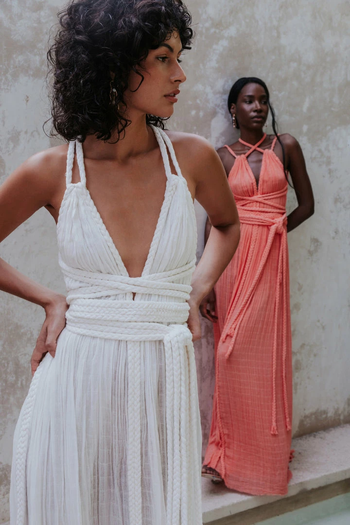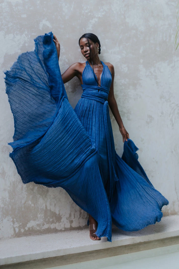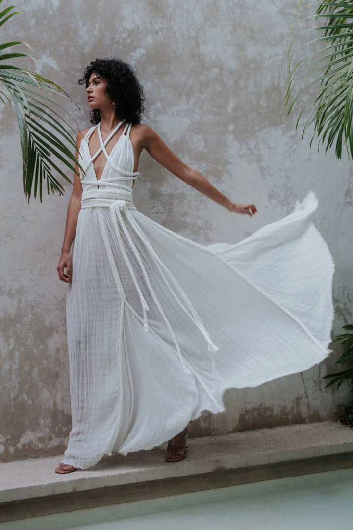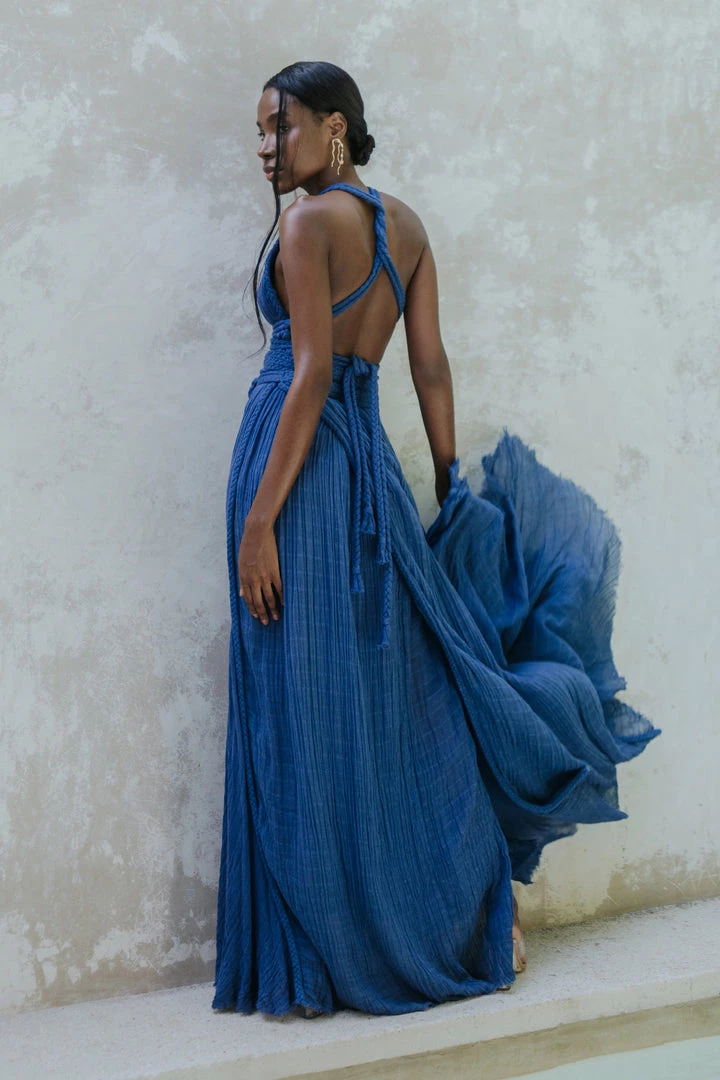 Take the plunge in this deep V halter top Gown! As with every Kasia Kulenty design, their signature braided ties can be styled in a multitude of ways to create dramatic silhouettes and points of interest. A more traditional cut at first glance, Gisela Gown wows with every turn – featuring a completely backless composition and a full flowing wrap around skirt. Dramatic panel inserts make for a breathtaking butterfly effect. Double layer fabric at bust for additional coverage.