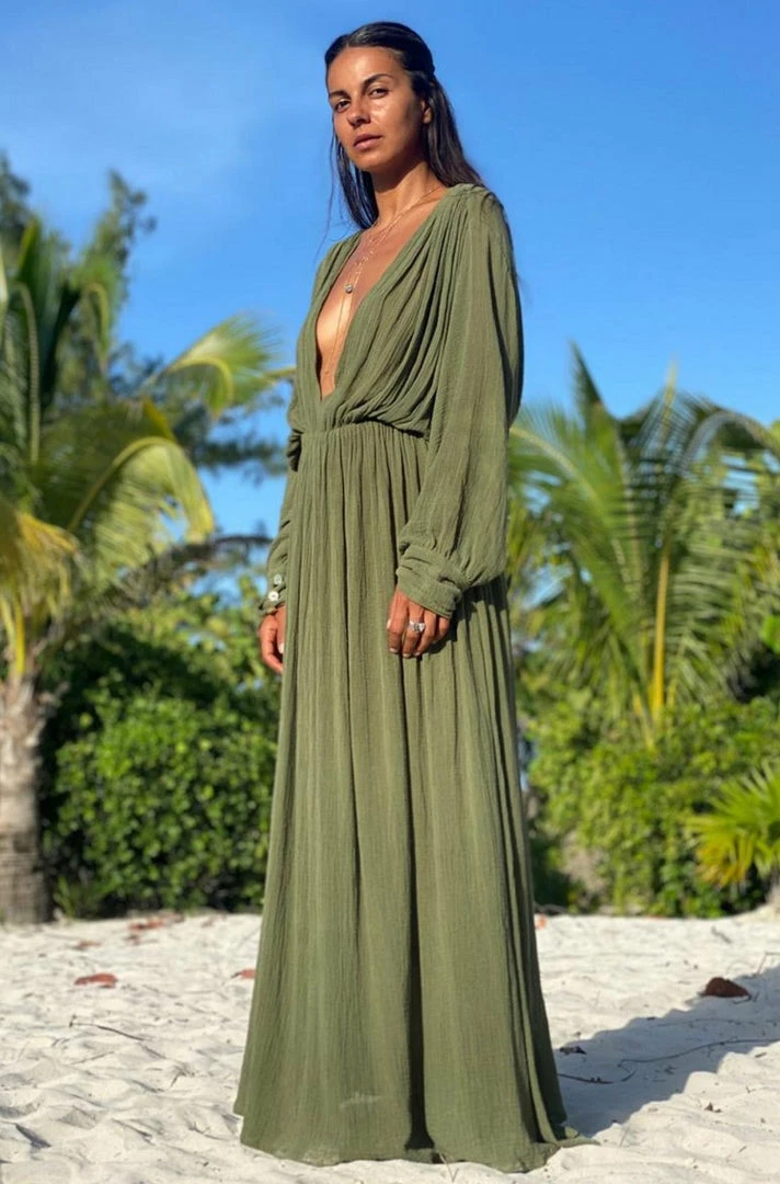 Helena long dress made of cotton gauze with a deep neckline at the front. Long sleeves with mother-of-pearl shell buttons and elastic waist. Reflect the brightness of your walk at all times with this beautiful and sensual dress.