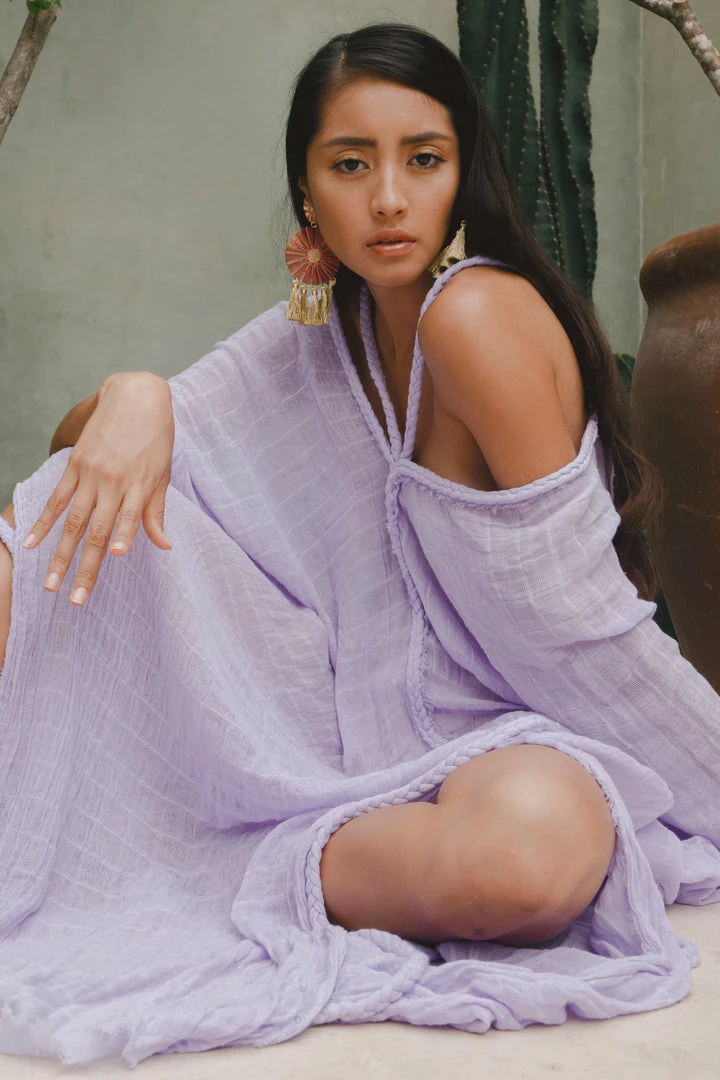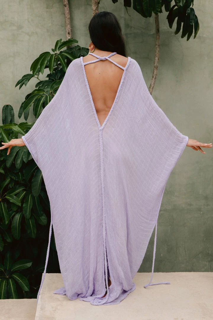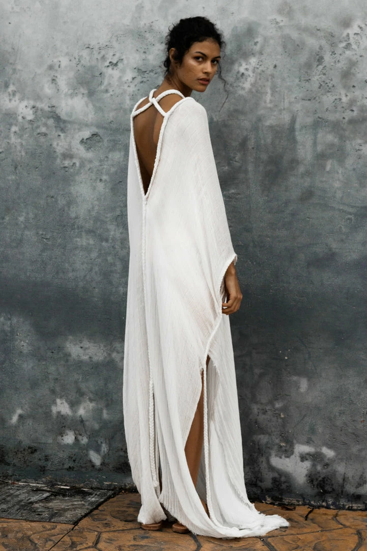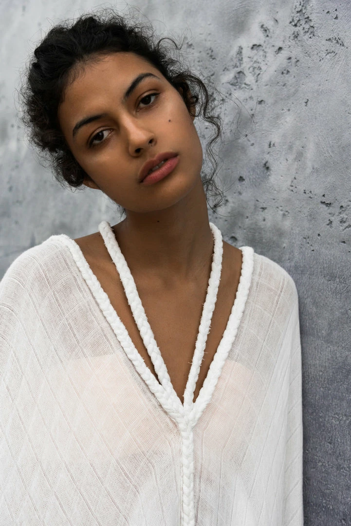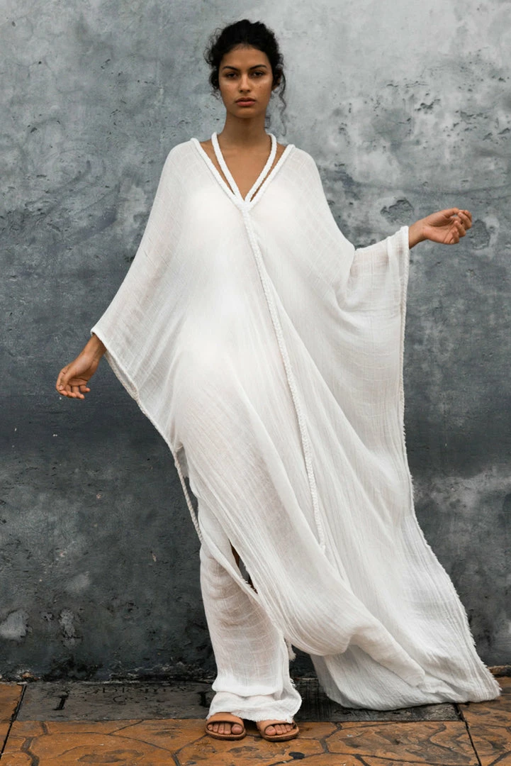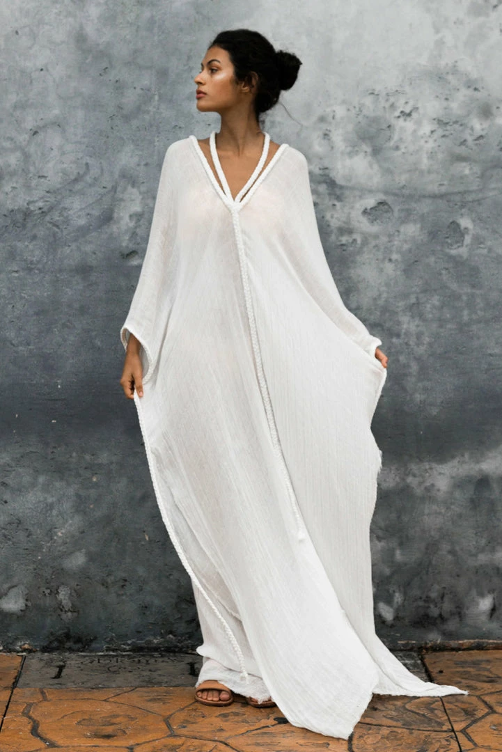 Airy and fluid in design. Generously trimmed with strings of woven by hands cascading braids. Uniquely designed pendant neckline to hold the kaftan in place or to let it gently slip off the shoulder.