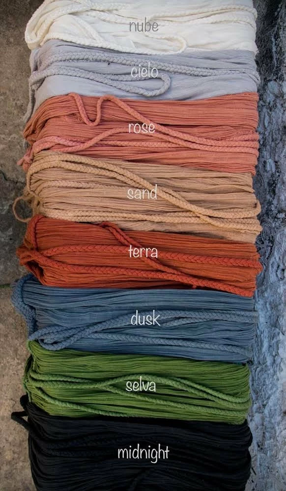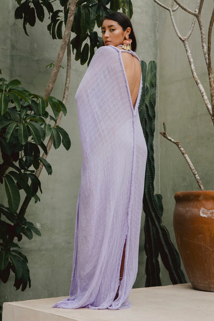 Every dress is meticulously handmade and plissed in soft cotton gauze fabric then dyed individually by hand with non-toxic dyes. Uniquely designed and well thought out system of wraparound braiding and fabric draping makes this one size dress fit and complement all body shapes.