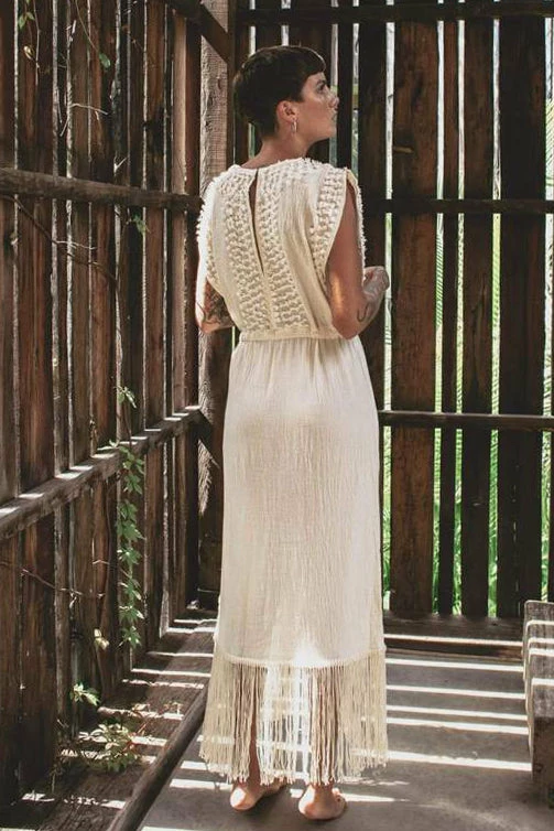 Innocence dress hand embroidered, and with silk and bamboo fringes. Handmade by artisans from remote communities in Mexico.