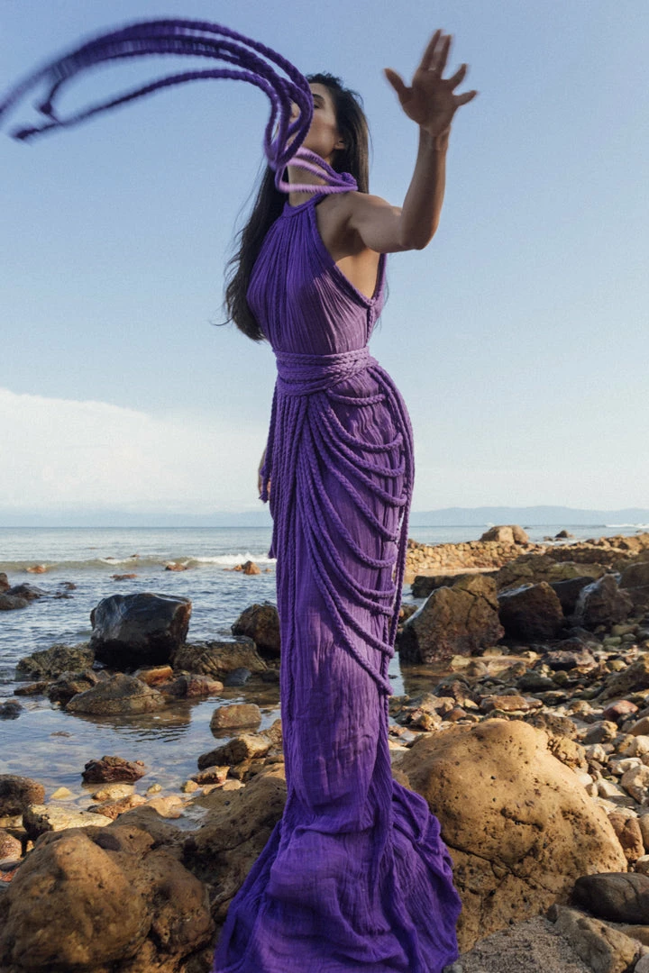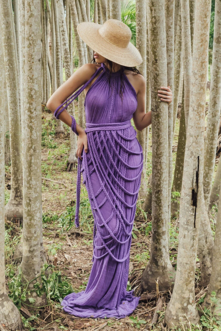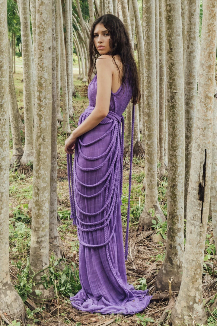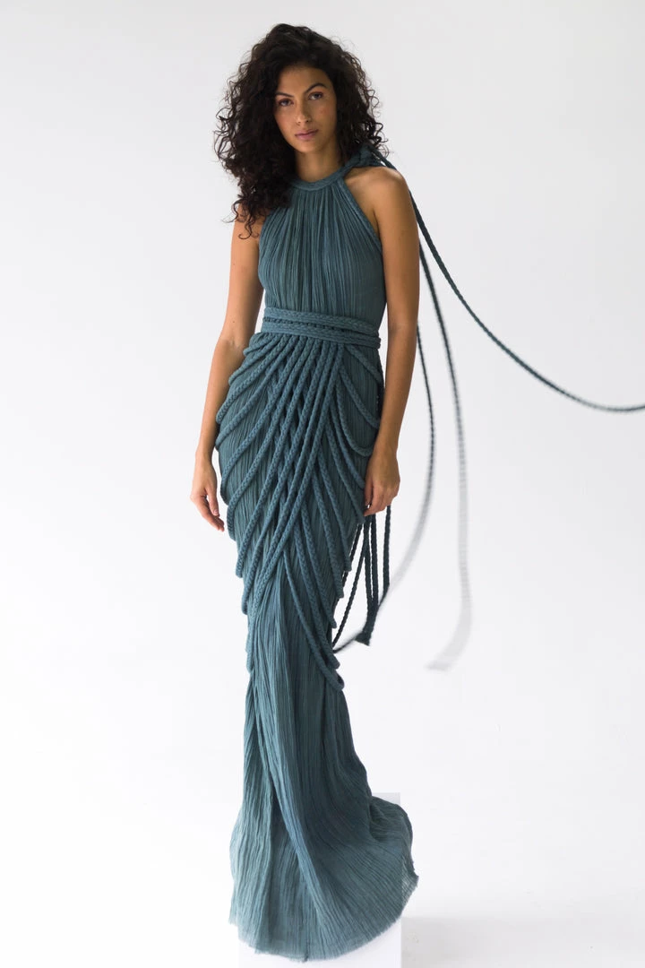 Introducing Vera Gown, a stunning two-piece gown set! This unique A-line halter dress ties on one shoulder and includes a braided accessory piece that can be worn as a skirt overlay, shoulder shrug, or even separately as a beach pareo!