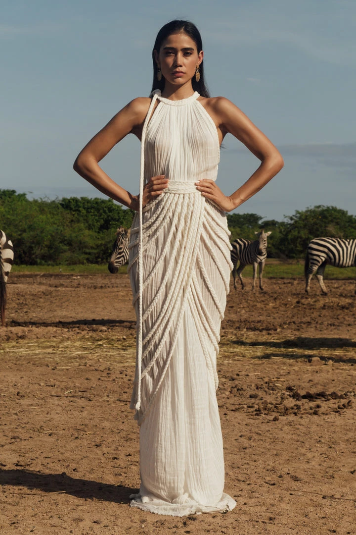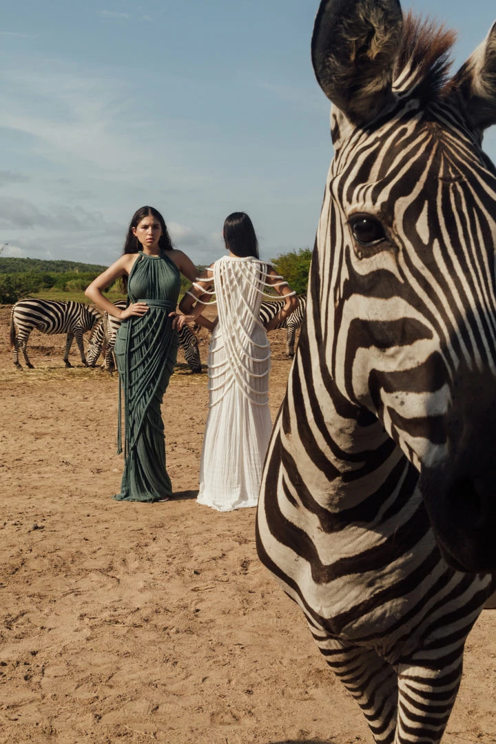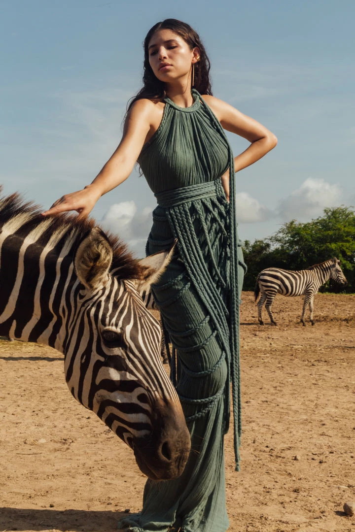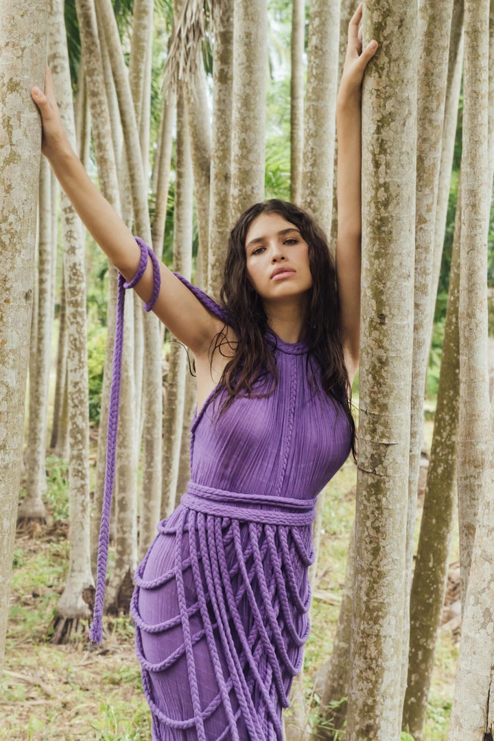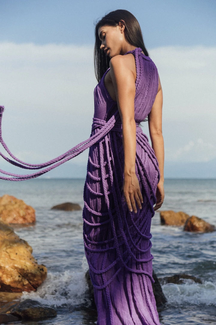 Introducing Vera Gown, a stunning two-piece gown set! This unique A-line halter dress ties on one shoulder and includes a braided accessory piece that can be worn as a skirt overlay, shoulder shrug, or even separately as a beach pareo!