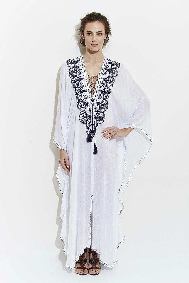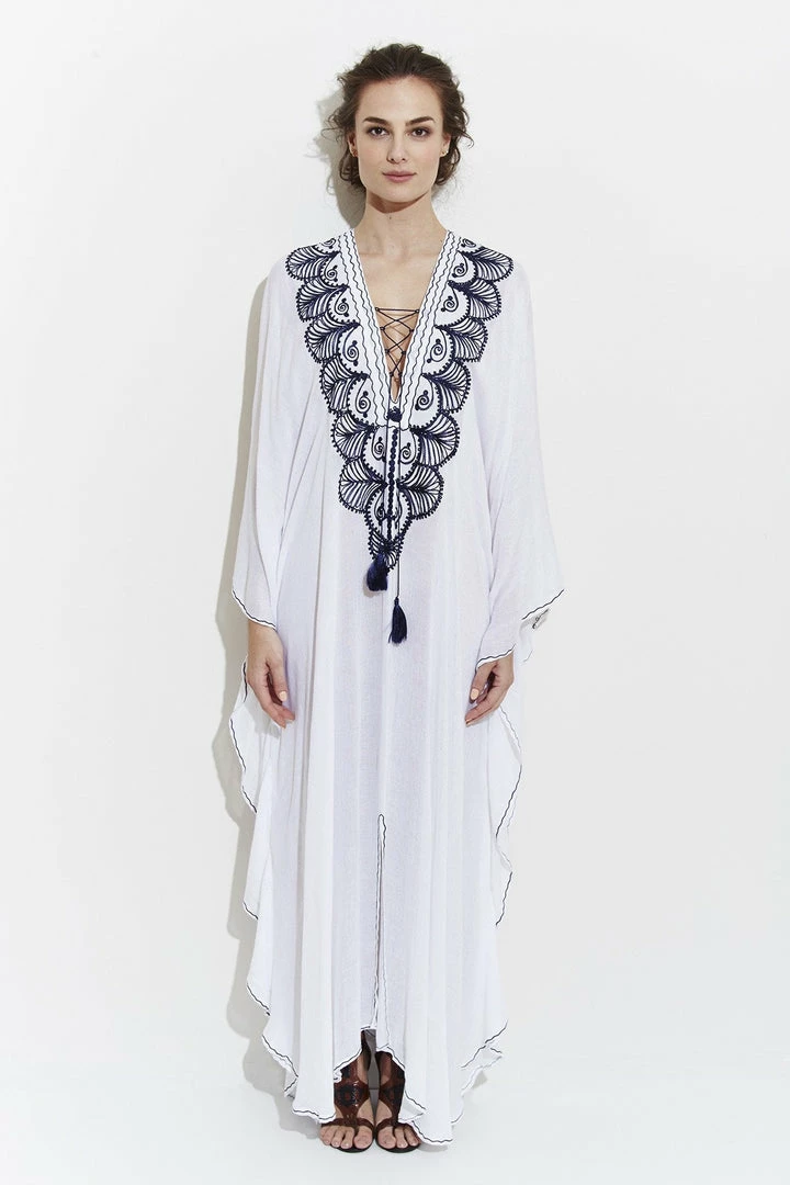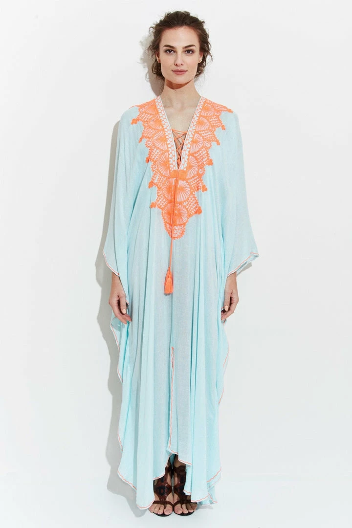 El Fenn is an authentic Moroccan kaftan. It is great to wear as a swim cover up, from morning until nighttime making a very elegant statement. This vibrant kaftan is ultra soft, made from the finest Egyptian cotton.