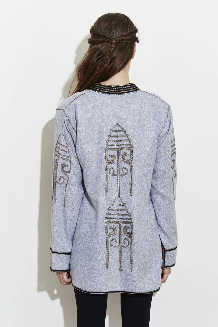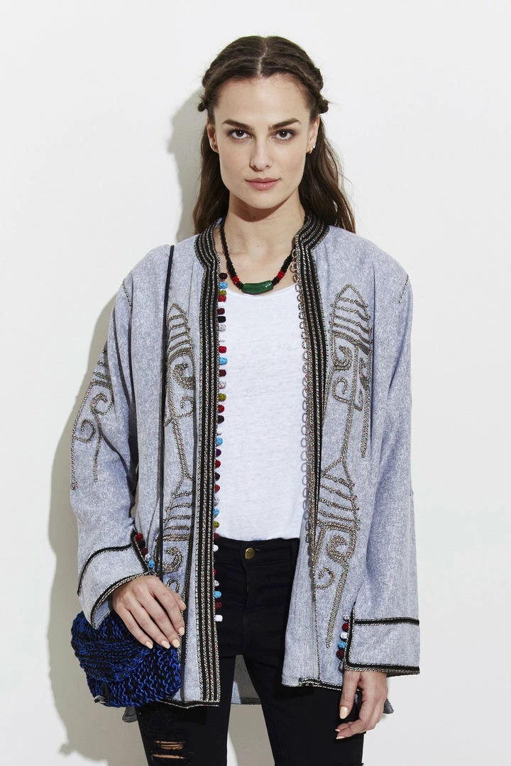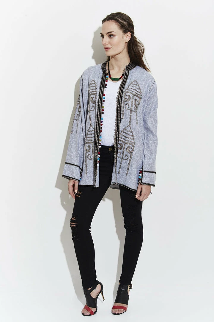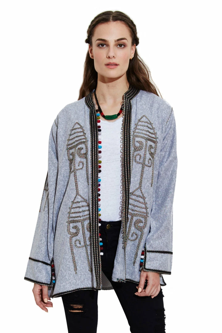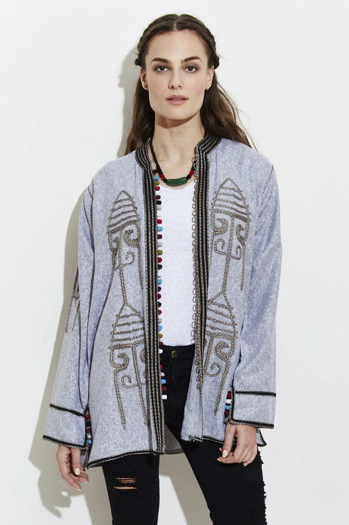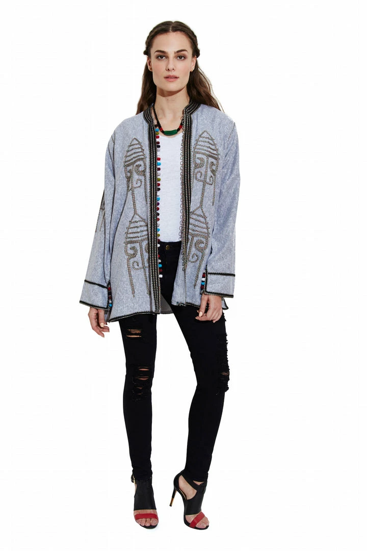 Oversized lightweight hand-embroidered jacket for a free-spirited look.