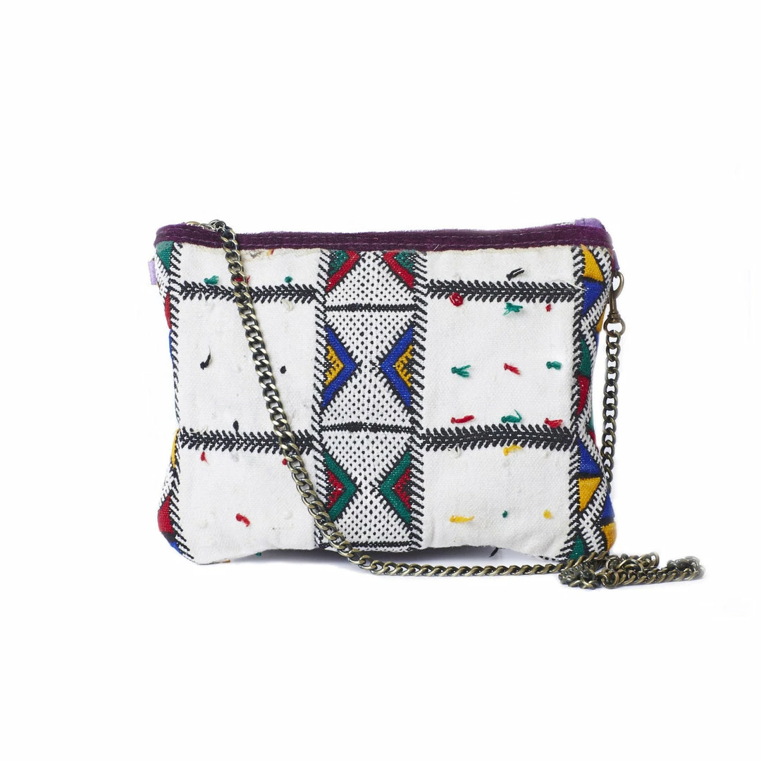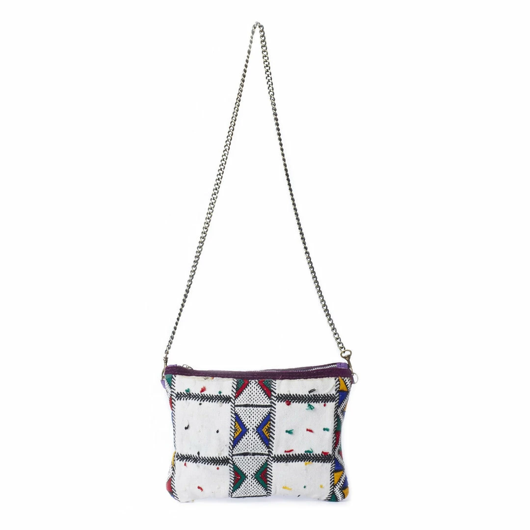 Kilim Bag shown here in white. Features traditional moroccan kilim, shoulder chain strap and zipper closure. Cross-body chain length.