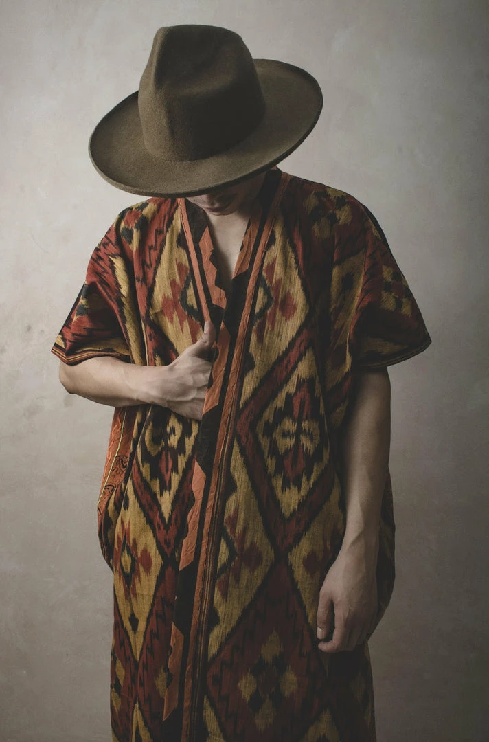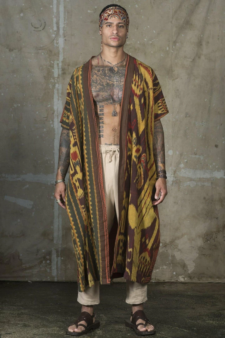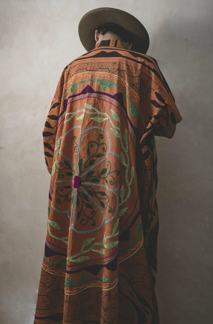 The Shipibo Kimono is the combination of two Indigenous communities. The fabric in front is from the Sumba Island in Indonesia, and the back is the sacred hand embroidery by the Shipibo indigenous community from the Amazon rainforest in Peru.