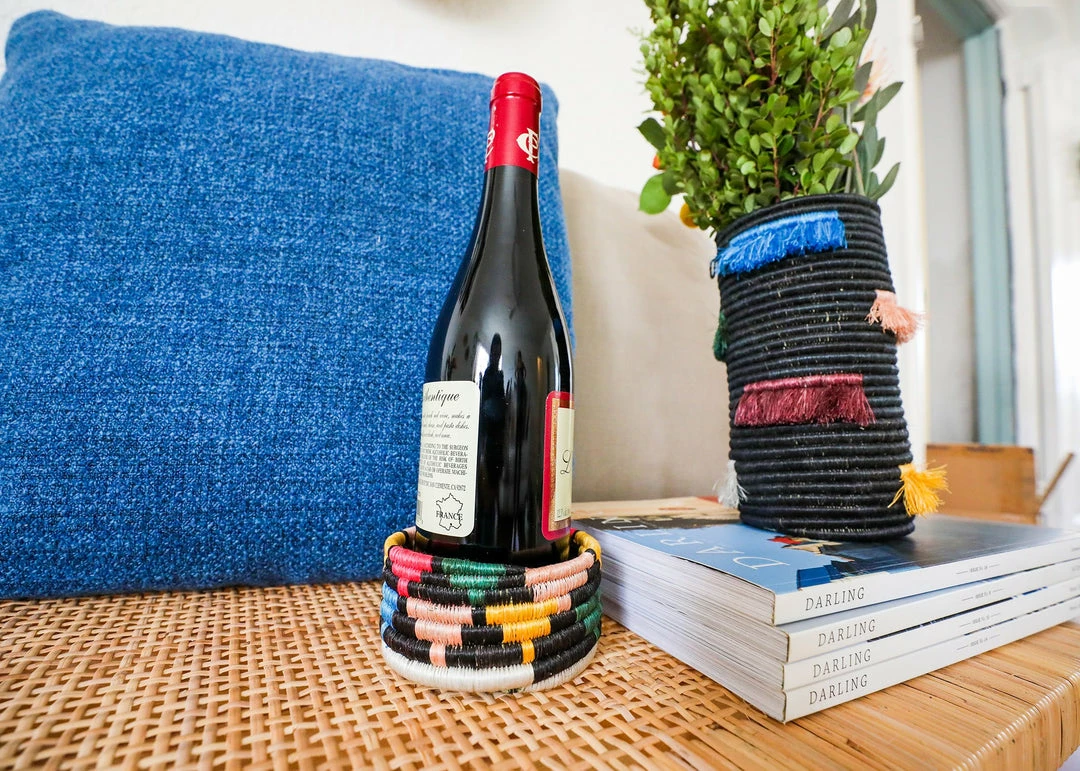 Intricately crafted with timeless tradition, this carefully dyed sisal fiber and sweet grass wine bottle coaster set makes a bold and exciting statement piece for you next wine party!