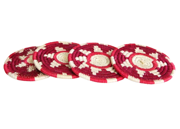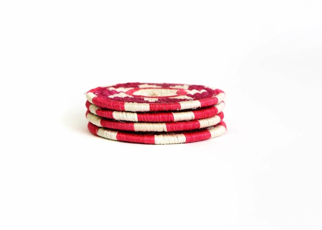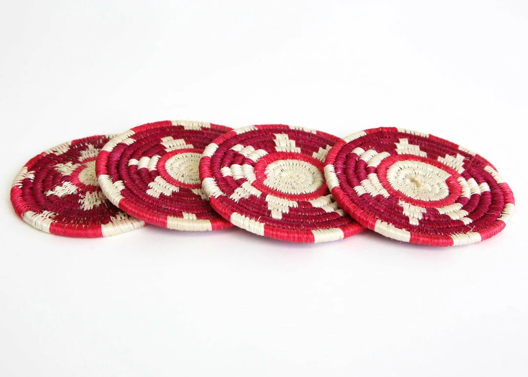 These delicately textured and handcrafted coasters were made by groups of women in intimate communities across Rwanda. They use the sisal agave plant and sweet grass to weave them together.