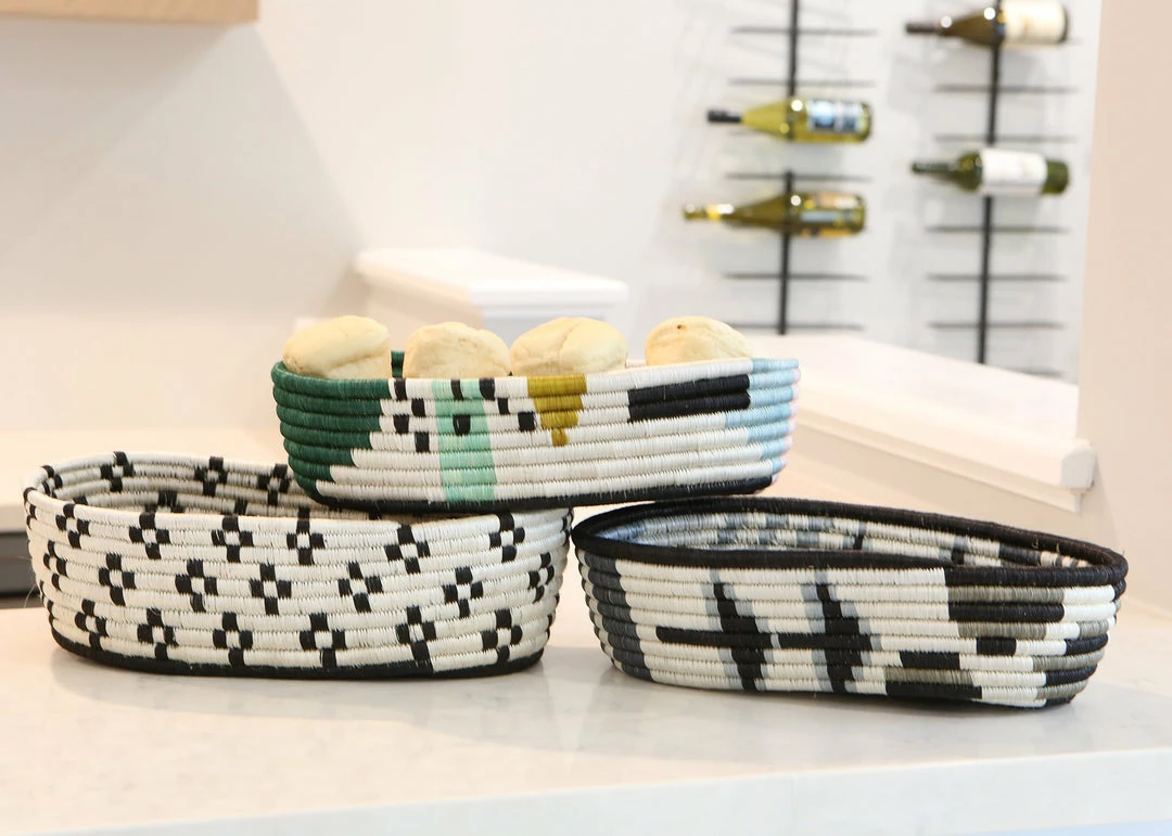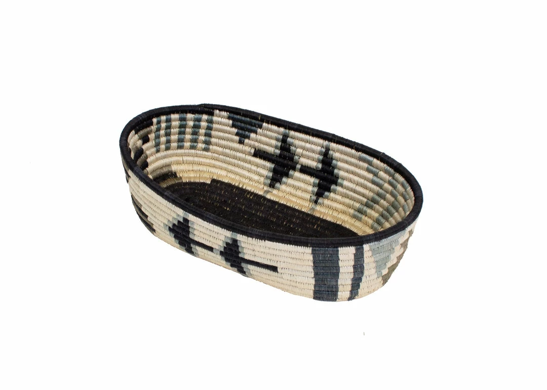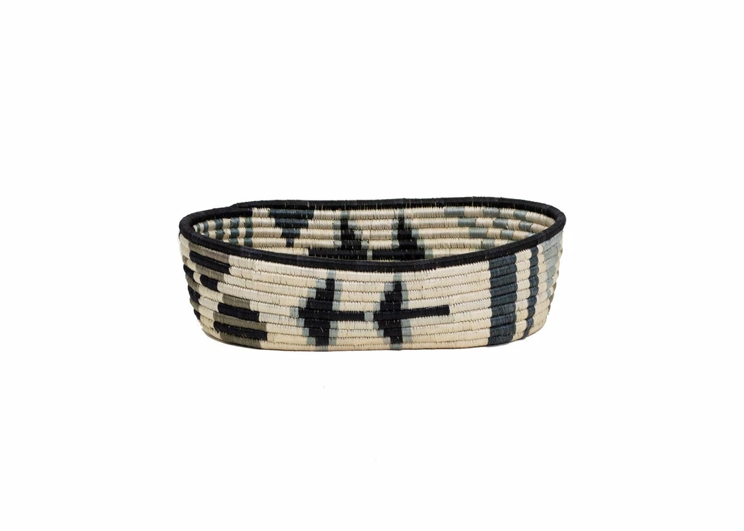 Intricately crafted with timeless tradition, this carefully dyed sisal fiber and sweet grass oval basket makes a stunning statement piece. This basket will make a globally conscious and stylistic addition to your home and table. Style your next dinner party with this oval shaped basket–perfect for bread, wooden spoons or as a fruit bowl.