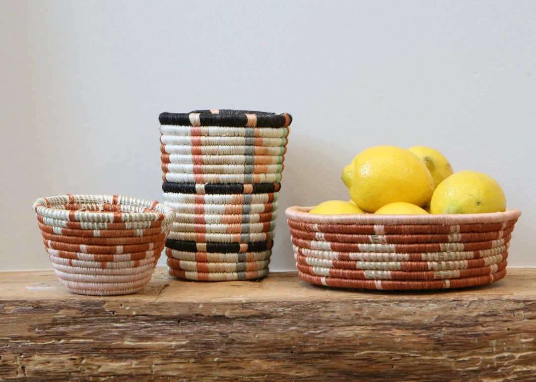 These delicately textured and handcrafted vases were made by groups of women in intimate communities across Rwanda. They use the sisal agave plant and sweet grass to weave them together.