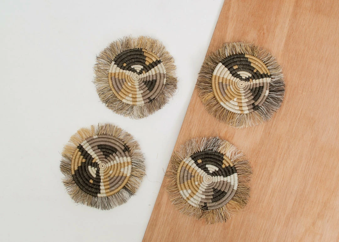 These delicately textured and handcrafted coasters were made by groups of women in intimate communities across Rwanda. They use the sisal agave plant and sweet grass to weave them together.