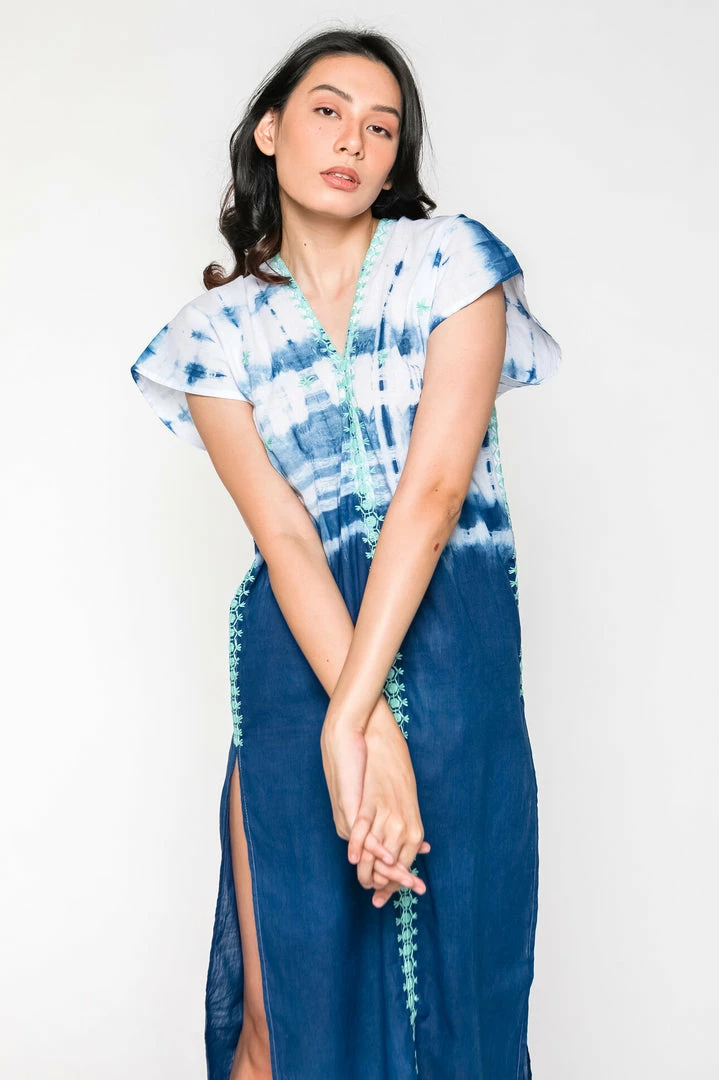 Lounge in this beautiful Kaftan, perfect for cocooning at home or adventures at the beach. Each Kaftan is hand dyed with Natural Dyes using Shibori techniques, and adorned with Sacred Hand Embroidery by the Itneg Tribe. Natural Dyes are plant-based and derived from ancient earth pigments dating back to the Old Stone Age.
