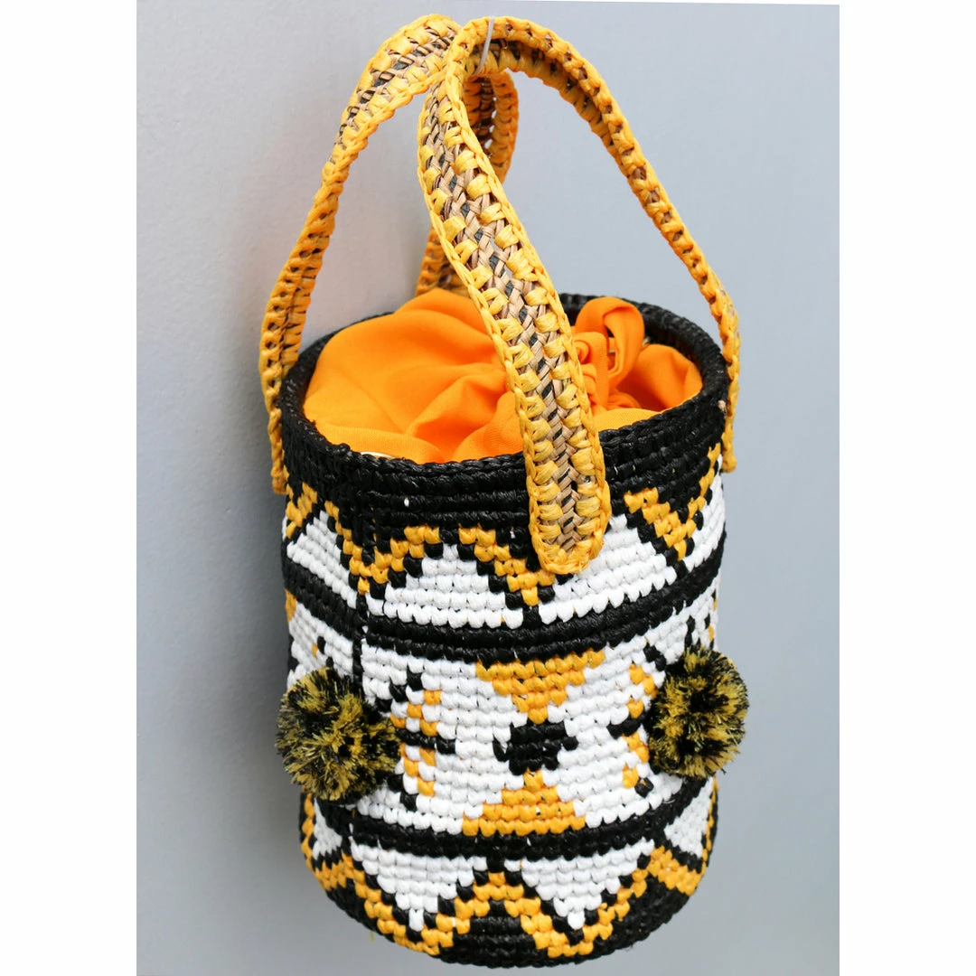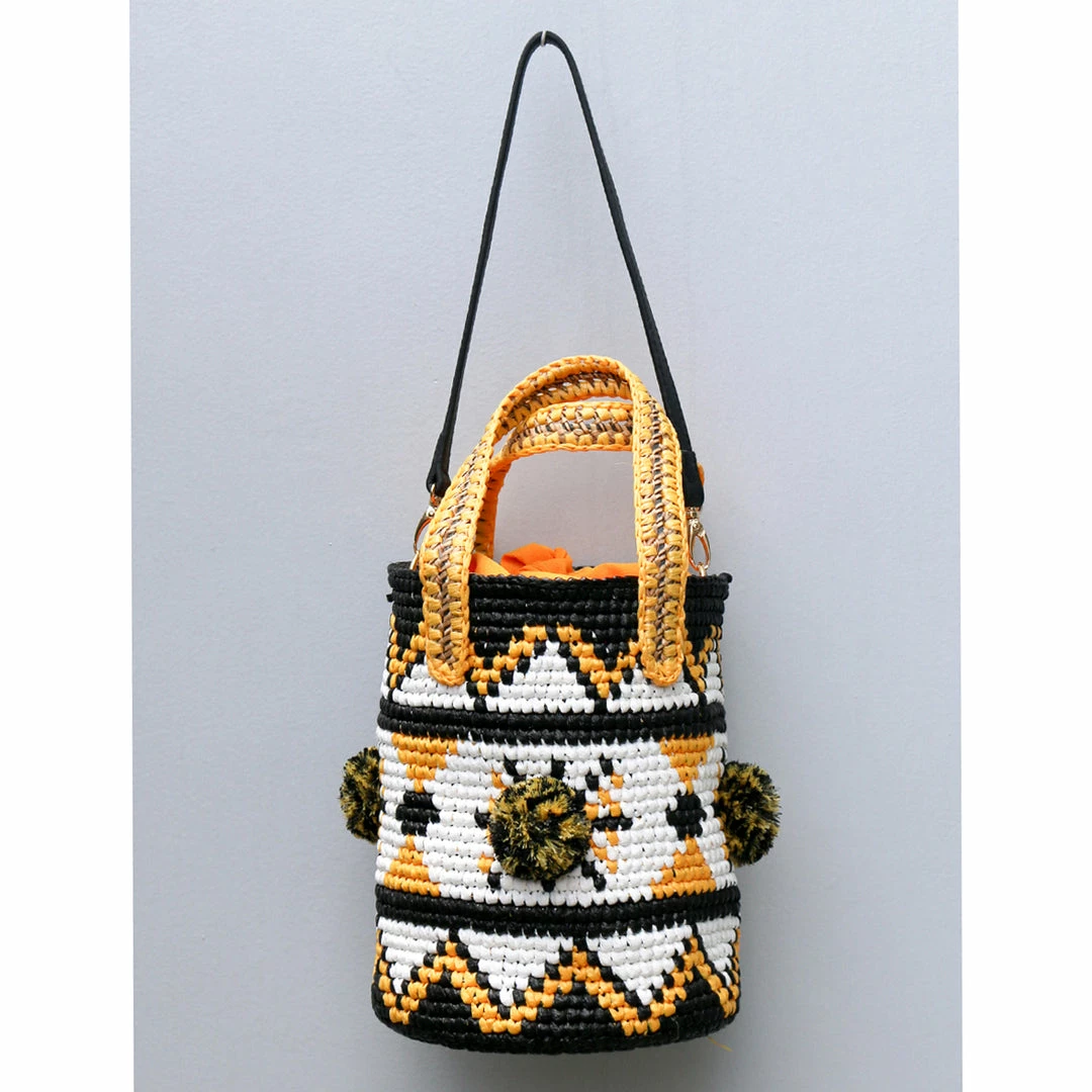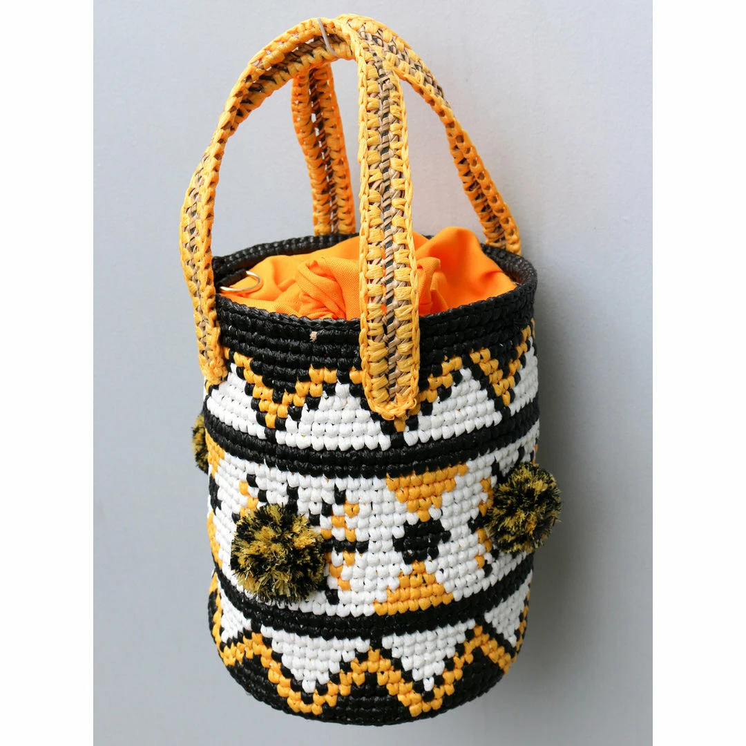 El Nido Bag handwoven by mothers on Mindanao Island, bold tribal graphic motif and pompoms adorn this modern cylinder shape.