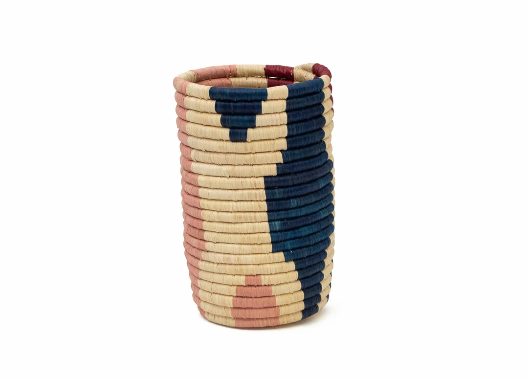 Intricately crafted with timeless tradition, this carefully dyed raffia fiber and sweet grass cylindrical vase makes a stunning statement piece. One or more of these vases will make a globally conscious and stylistic addition to your home. Our medium vase comes with a glass liner from the collection to display a bouquet of flowers or a plant. Alternatively this vase can be used to hold a bottle of wine, desk supplies, or kitchen utensils.